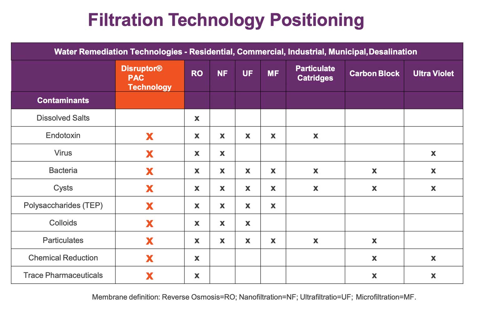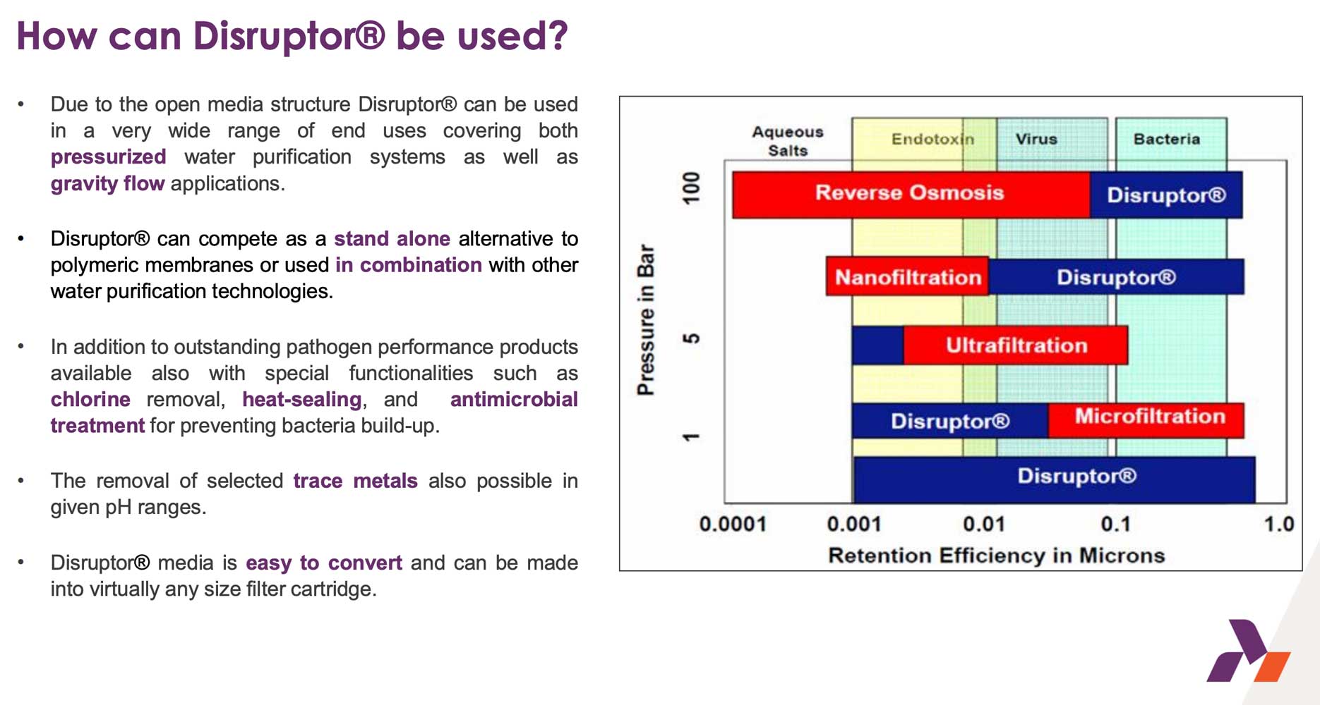 - Compared with UF/hollow fiber and membranes, Disruptor® offers high flow rates at low pressure drop, is suitable for gravity and pressure systems, and requires less material.