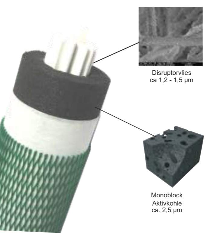 Kombiniert man das Ahlstrom-Munksjö Disruptor® Filtervlies mit einem hochwertigen, gesinterten Carbonit Aktivkohleelement, erhält man eine sehr effektive Patrone, mit der eine enorme Bandbreite von Schadstoffen gefiltert werden kann und das bei einer hohen Geschwindigkeit. Carbonit hat bereits eine solche Patrone entwickelt und auf den Markt gebracht. Es handelt sich um die Carbonit IFP VS Kombifilterpatrone.