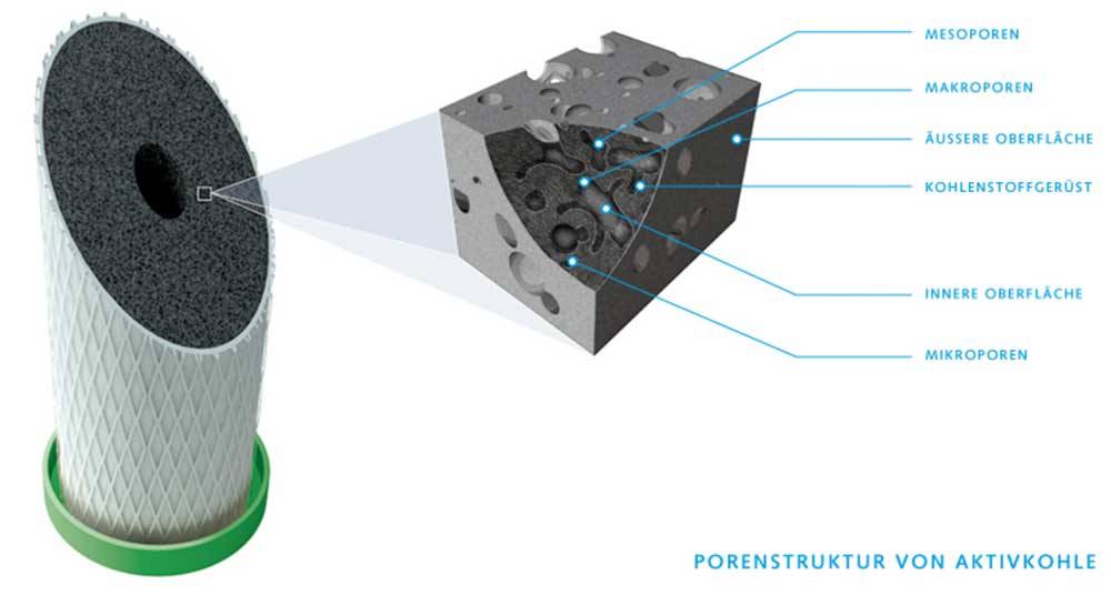 Aktivkohleblockfilter von Carbonit sind nach einem speziellen Verfahren hergestellt. Es handelt sich um sogenannte gesinterte, d.h. gebackene Aktivkohleblöcke. Die so entstandenen Aktivkohleblöcke absorbieren Schadstoffe & Bakterien sehr gründlich und geben diese nicht wieder ab. Die meisten auf dem Markt angebotenen Aktivkohlefilter bestehen entweder aus losem Granulat oder aus Granulat gepressten Blöcken. Die Adsorptionsfähigkeit dieser Filter liegt wesentlich unter dem der gebackenen Aktivkohlefilterpatronen von Carbonit. Loses Granulat bindet nur an der Oberfläche, es findet also keinerlei Microfilterung statt, sondern nur die chemische Reaktion der Aktivkohle. Bei gepressten Aktivkohleblöcken muss sehr viel Bindemittel verwendet werden, welches die Poren der Kohle verklebt und dadurch die effektive Öberfläche der Aktivkohle massiv reduziert. Beim Sinterverfahren von Carbonit entsteht ein Aktivkohleblock mit einer extrem hohen chemischen Adsoptionsfähigkeit und einer sehr feinen Porengröße (0,45 μm). Dadurch werden dem Wasser die Schadstoffe über mechanische Zurückhaltung bzw. Filterung im Microbereich und durch chemische Reaktion mit der Aktivkohle entnommen. Das macht die Carbonit NFP Premium und alle anderen Carbonitpatronen so effektiv. Wie schon erwähnt sind die Carbonit Filterpatronen sehr sicher, da bereits gebundene Schadstoffe niemals wieder ausgeschwemmt werden können. Wenn die Aufnahmekapazität der Filterkartusche erreicht ist, dann "verblockt" die Patrone, d.h. es fließt kein Wasser mehr hindurch. Je näher das Ende der Kapazität kommt, desto weniger Wasser fließt durch. Sie sehen es also wenn die Patrone "voll" ist. Bei Aktivkohlepatronen anderer Hersteller, kann es nach Erreichen der maximalen Aufnahmekapazität dazu kommen, daß die gebundenen Schadstoffe in hoher Konzentration wieder ans Trinkwasser abgegeben werden, ohne daß der Benutzer es merkt. Die Filter "bluten aus" und Sie trinken die Schadstoffe mit Ihrem Wasser. Dies ist ein massives Gesundheitsrisiko. Deshalb setzten wir auf Carbonit Aktivkohlefilter und machen keine Experimente. Ihrer Gesundheit zuliebe! | Überblick: Was filtert Was? Aktivkohle oder doch Umkehrosmose?