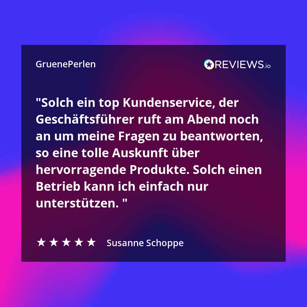 Wir nutzen Reviews.io seit Mitte 2023 zur automatischen Bewertungsabfrage. Auf dem Profil können Bewertungen zu GruenePerlen GmbH abgegeben werden. Der Anbieter liefert einen tollen Service, bei dem unsere Kunden sowohl unser Unternehmen, als auch die gekauften Produkte bewerten können. Es sind sogar Foto & Videobewertungen möglich. Der Service ist der beste, den wir bisher genutzt haben. Daher werden wir vermutlich auch dauerhaft bei diesem Anbieter bleiben.