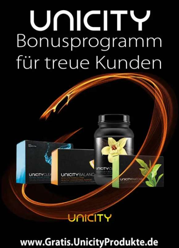 Dieses außergewöhnliche Bonusprogramm können Sie allerdings nur nutzen, wenn Sie sich DIREKT von Unicity beliefern lassen. Bei einem Einkauf über uns, ist dies NICHT möglich. Nebenbei erwähnt gibt es einen weiteren Vorteil für Direktbesteller. Als Kunde haben Sie generell eine 60 Tage Zufriedenheitsgarantie und erhalten Ihr Geld zurück, wenn Sie mit dem Produkt nicht zufrieden sind. Wenn Sie mehr über dieses außergewöhnliche Bonusprogramm wissen wollen, kontaktieren Sie uns gern telefonisch, über SMS & Whatsapp: +491639163787 oder über das Kontaktformular weiter unten. (Bedingungen Unicity Bonusprogramm)