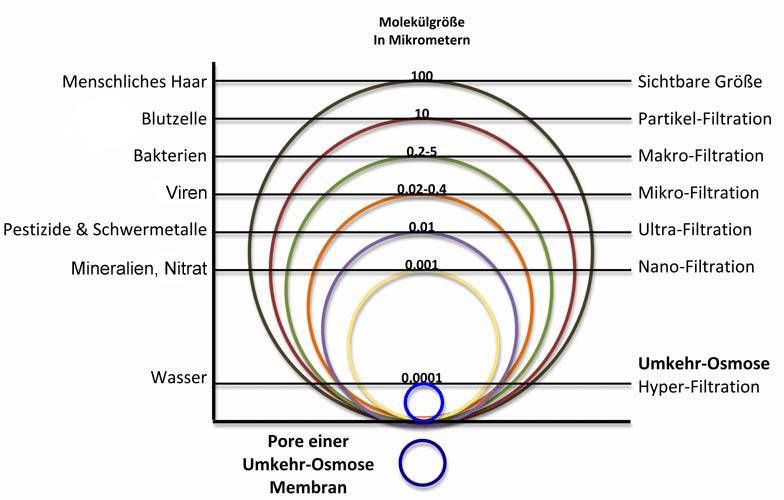 Die Umkehrosmose ist das einzige Verfahren, um ein absolut reines Trinkwasser zu erhalten. Die Umkehrosmose entfernt alle Schadstoffe wie z.B. Schwermetalle, Uran, Nitrat, Nitrit, Phosphate, Sulfate, Fluoride, Fungizide, Herbizide, Pestizide, Medikamentenrückstände, Hormone, Asbest, Keime, Bakterien, Viren, Mikroplastik, Chloroform, Chlor, Glyphosat, Nanoteilchen, Metalle, Mineralien, u.v.m. aus dem Wasser. Im Prinzip wird alles aus dem Wasser herausgelöst, dessen Molekülgröße über der von Wassermolekülen liegt und das ist praktisch nahezu alles. Die reale Leistung bzw. Rückhaltung einer Membran liegt immer bei ca. 93-98%. Es wird also immer ein Restgehalt an Partikeln verbleiben. Dies ist auch so gewollt, denn es ist in Deutschland verboten, Umkehrosmoseanlagen mit einem ppm Wert von 0 an den Verbraucher zu verkaufen. Es gibt diese leistungsfähigen Anlagen, allerdings sind sie kostspielig und der Kunde muss wissen, was er da tut, wenn er solche Anlagen einsetzt, da das komplett entmineralisierte Wasser äußerst aggressiv ist.Was filtert, welche Filtertechnik?