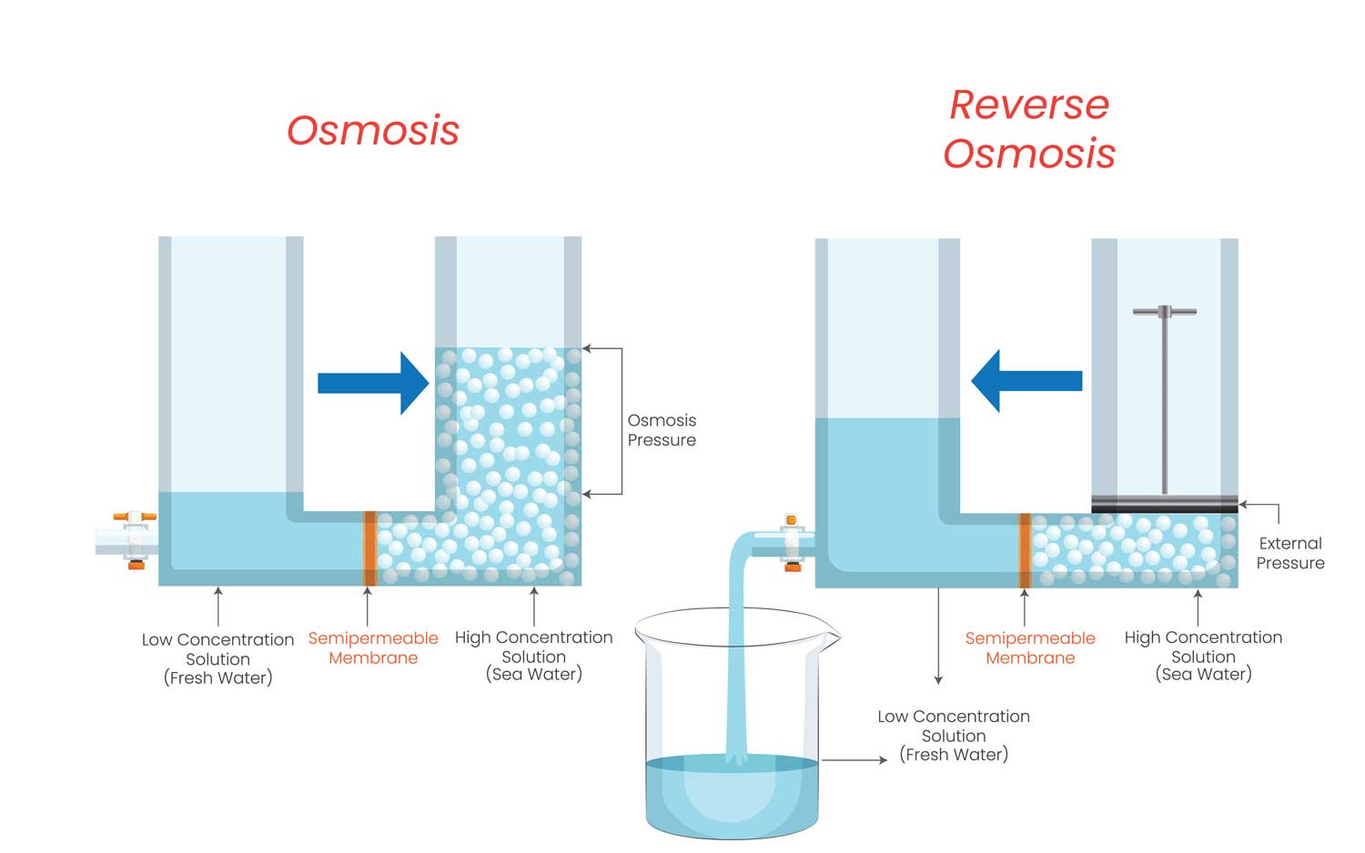 Bei der Umkehrosmose wird Rohwasser gegen eine synthetische, semipermeable (halbdurchlässige) Membran gepresst, die für Wassermoleküle durchlässig ist, für Unreinheiten des Rohwassers jedoch nicht. Auf der anderen Seite der Membran sammelt sich daher nur sauberes Wasser. Die Verunreinigungen werden weggespült und in den Abfluss geleitet. Die Osmosemembran lässt nur Wassermoleküle durch. Um das Rohwasser durch die Membran zu drücken reicht ein Wasserleitungsdruck von 3 bar bereits aus. Mit einer Boosterpumpe bei Direktflussanlagen ist der Druck höher und es kann ein besseres Reinwasser/Abwasserverhältnis erzielt werden. Bei pumpenlosen Systemen liegt das Reinwasser/Abwasserverhältnis meist bei 1:7 bis 1:3, bei Direktflussanlagen geht das Verhältnis bis auf 1:1 herunter. Unsere Direktflussanlagen sind meist auf 1:1,5 bis 1:2 eingestellt, um die Membran zu schonen und dadurch die Lebensdauer zu erhöhen. Das Verfahren der Umkehrosmose ist daher geeignet, um ein reines Trinkwasser zu erhalten. Die Umkehrosmose entfernt alle Schadstoffe wie z.B. Uran, Nitrat, Nitrit, Fungizide, Herbizide, Medikamentenrückstände, Hormone, Asbest, Keime, Bakterien, Mikroplastik, etc. aus dem Wasser.