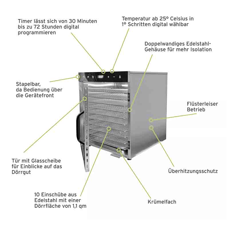 - Dörrfläche: 1,2 m², 12 Edelstahl-Einschübe