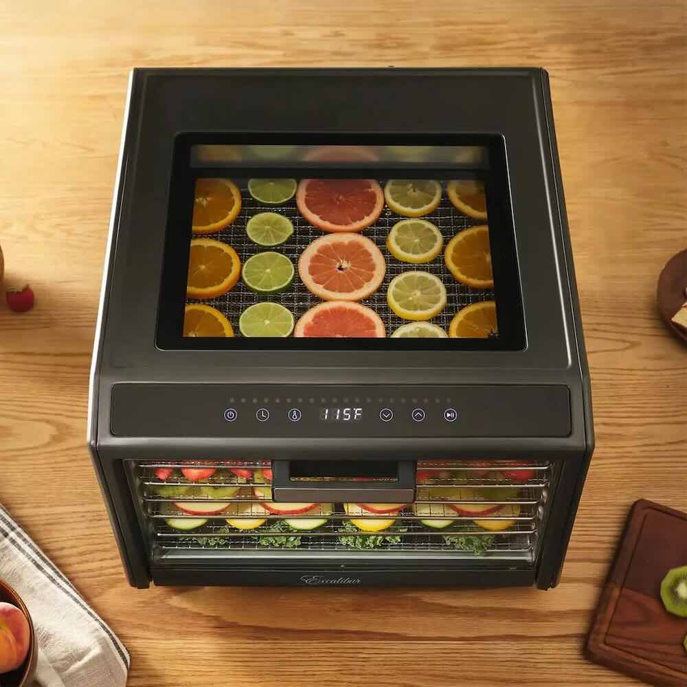 - Das Excalibur Dörrgerät verwendet die patentierte Hyperwave-Technologie, die eine wechselnde Hitze erzeugt und somit eine bessere Trocknung bei niedriger Temperatur gewährleistet.
