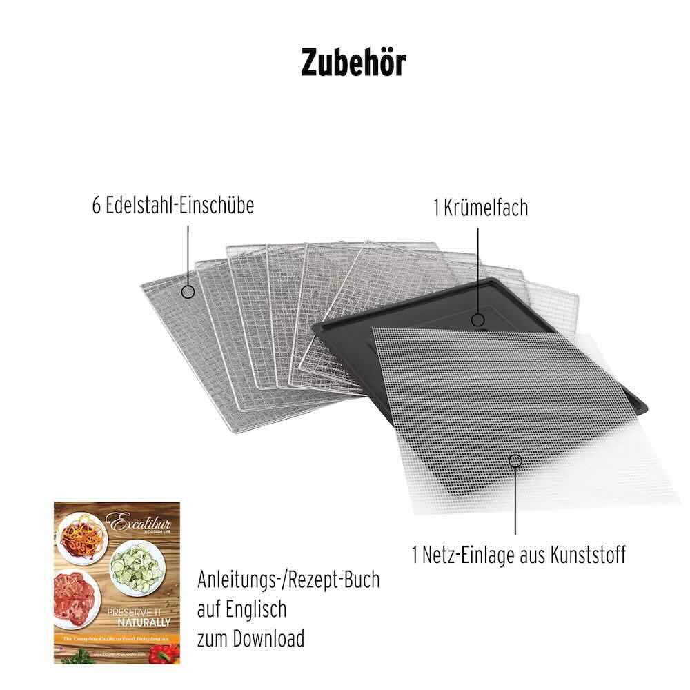 | Lieferumfang: | Excalibur Dörrautomat DS06SS, Krümelfach, Netz-Einlage, 6x Edelstahleinschübe, Bedienungsanleitung |