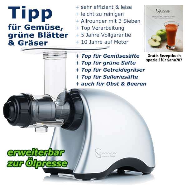 Tipp: Sana Juicer 707 ist ein absoluter Spezialist für langfaseriges Pressgut wie z.B. Weizengras, Stangensellerie, Wildkräuter, grüne Blätter und hartes Pressgut wie Karotten & Rüben. Dank des feinen und des zusätzlichen groben Siebes ist der Sana Juicer 707 die ideale Saftpresse zur Verarbeitung von Getreidegräsern, Wildkräutern, grünem Blattgemüse, hartem und weichem Obst und Gemüse. Wertvolle Nährstoffe wie Vitamine, Mineralstoffe und Enzyme werden effizient extrahiert und sorgen für eine hohe Saftqualität. Auch Beeren & Nüsse sind kein Problem für den Entsafter Sana Juicer 707. Durch das zusätzliche Blanksieb auch ideal für die Herstellung von Babynahrung, Eis, Pürees, Nussbutter oder Pasta. Ein absolutes Highlight ist die nachrüstbare innovative Ölpresse für klaltgepresste Öle in Rohkostqualität