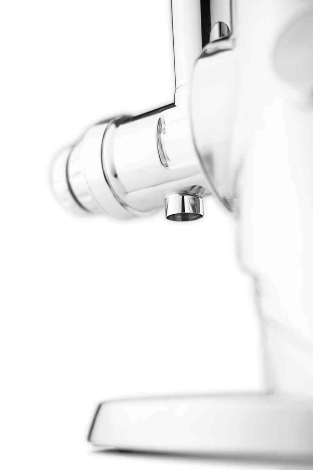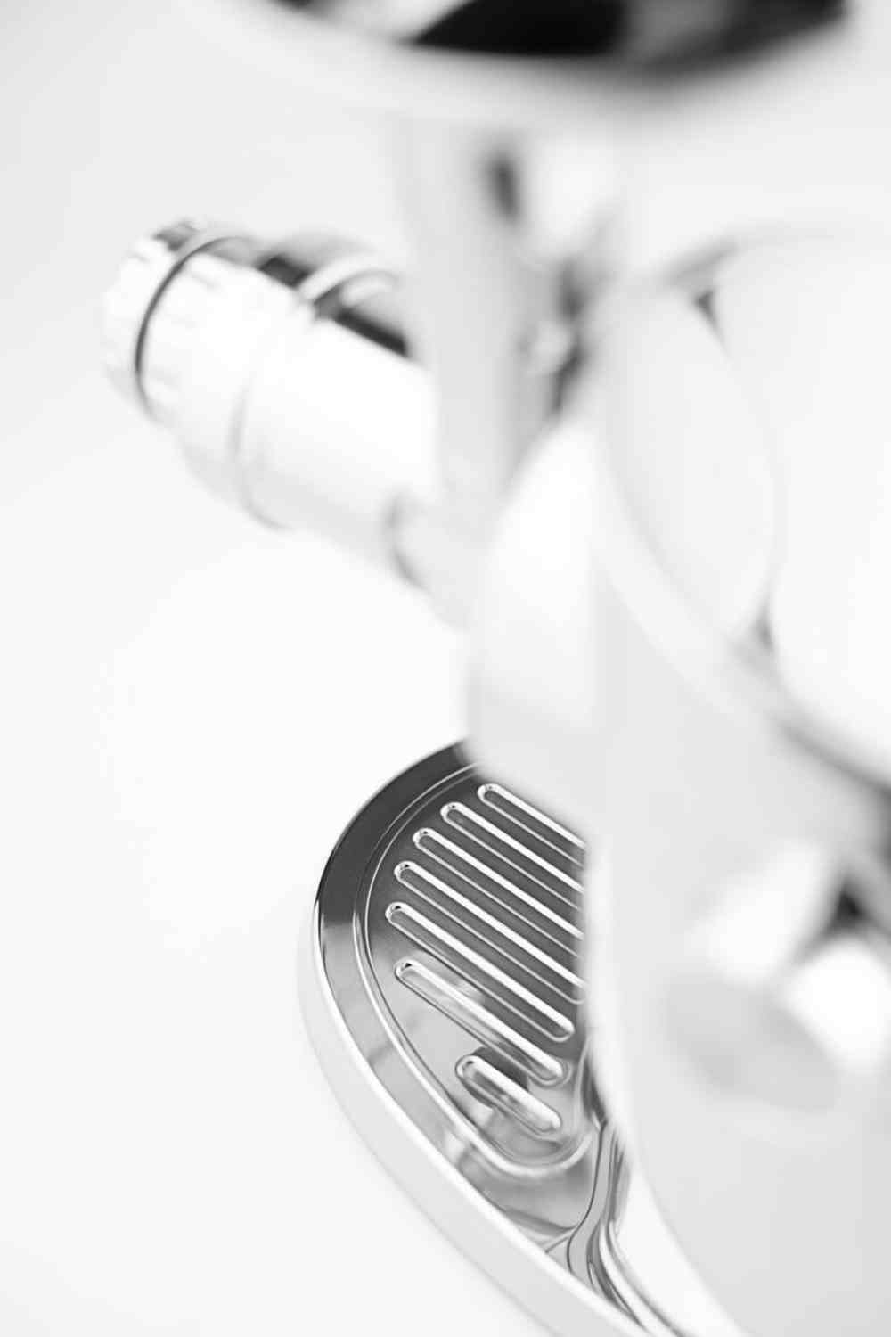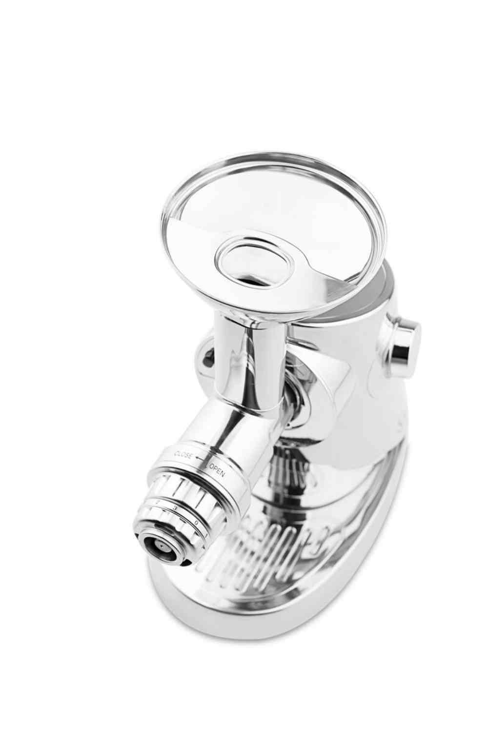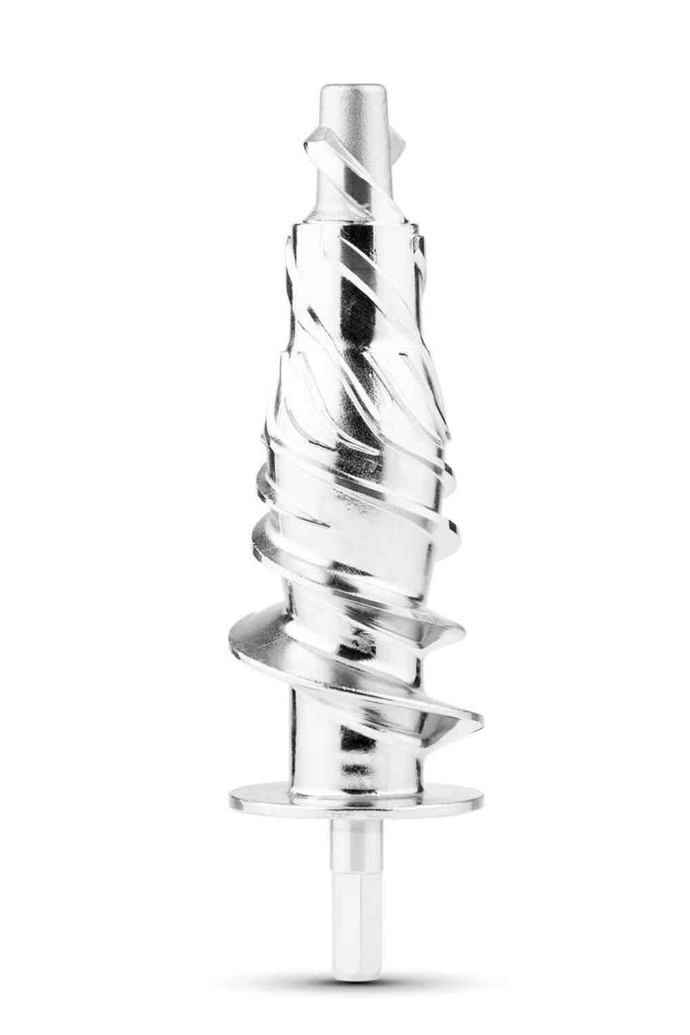 - Neue Verriegelungstechnik für Pressaufsatz: Das Befestigen der Press-Schnecke am Motorblock wurde vereinfacht. Anstatt die Schnecke mit einem Klemmsystem oder einer Verriegelung zu befestigen wird sie einfach angedockt und nach links gedreht. Die Schnecke rastet dabei automatisch und sicher ein. Das Entfernen ist ebenfalls kinderleicht. Drücken Sie die Entriegelungstaste und drehen diese nach rechts.