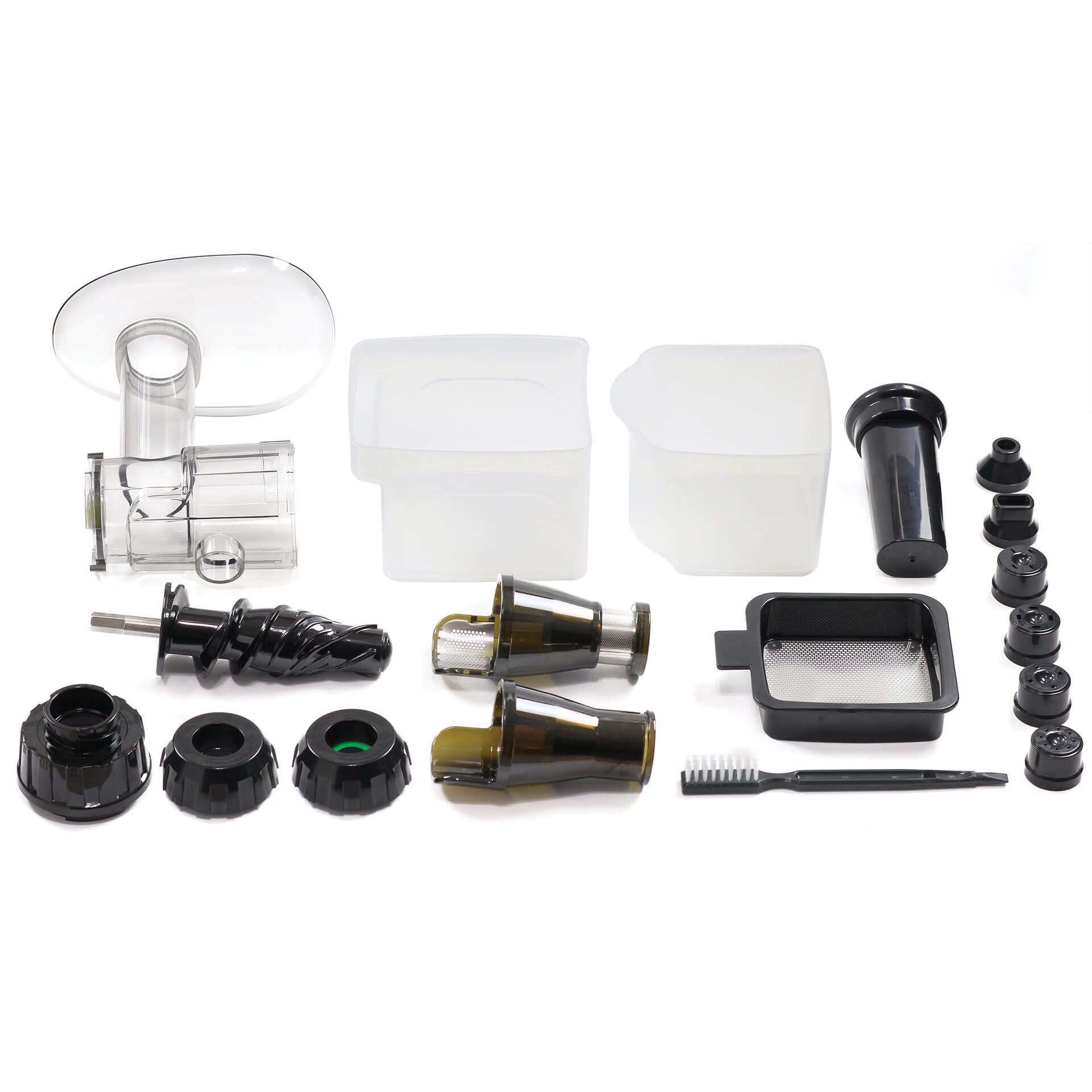 Motorblock mit Netzkabel, Entsaftungsgehäuse inkl. Einfüllschacht und Einfülltrichter, Pressschnecke, 2 regulierbare Auslass-Schrauben (einer speziell für Sellerie), Sieb-Einsatz, Pürier-Einsatz, Pasta- und Grissini Set (6 Düsen), Stopfer, Saftauffangbehälter (BPA-frei), Tresterauffangbehäter (BPA-frei), Schaumsieb, Reinigungsbürste, Deutsche Bedienungsanleitung