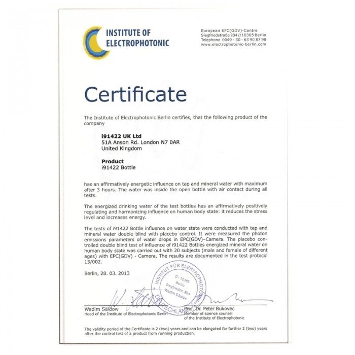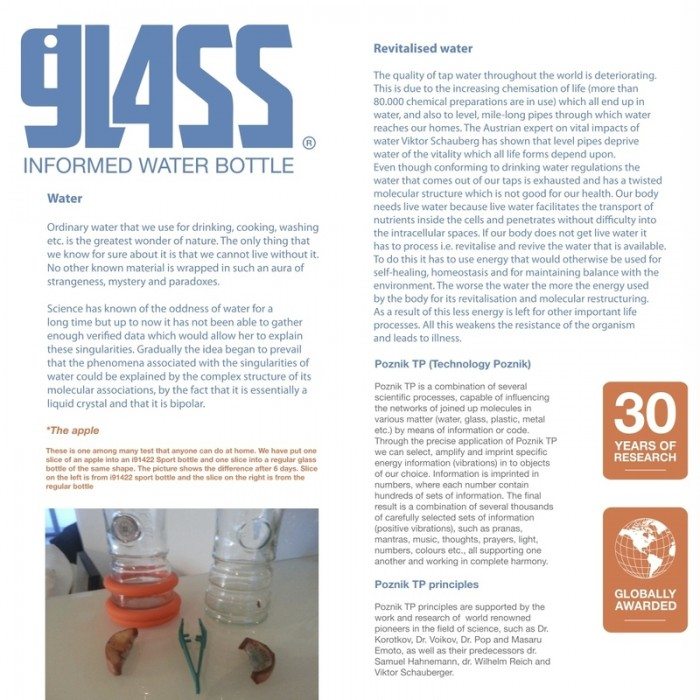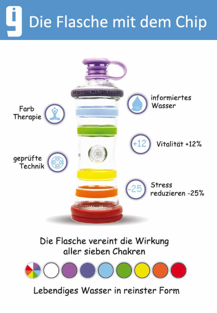 Aber die i9 Bottle ist nicht nur eine Flasche. Sie ist viel mehr. Diese Flasche informiert und harmonisiert Ihr Wasser! Auf der i9 Bottle Glasflasche sind viele positive Informationen "aufgespielt", welche dann auf Ihr Wasser übertragen werden. Das informierte Wasser überträgt die positiven Schwingungen wiederum auf Ihren Körper. Dies ist kein Hokuspokus, sonder basiert auf langjährigen Forschungen in der Quantenphysik. Die Homöophatie nutzt diese Naturgesetze übrigens auch. Es geht um Informationen und Schwingungen, welche vor allem von Wasser übertragen werden.