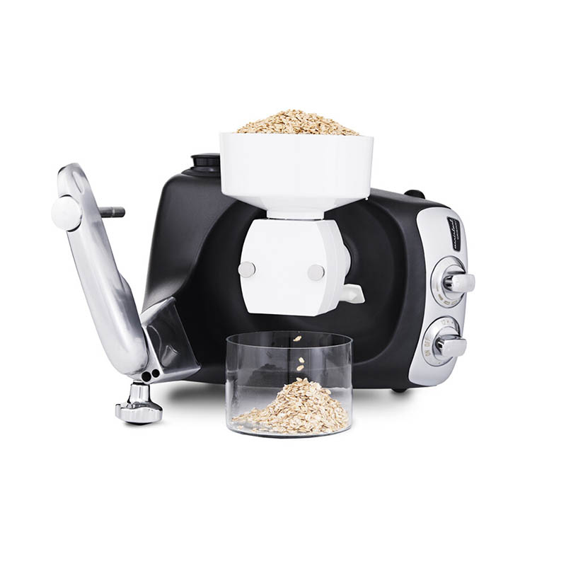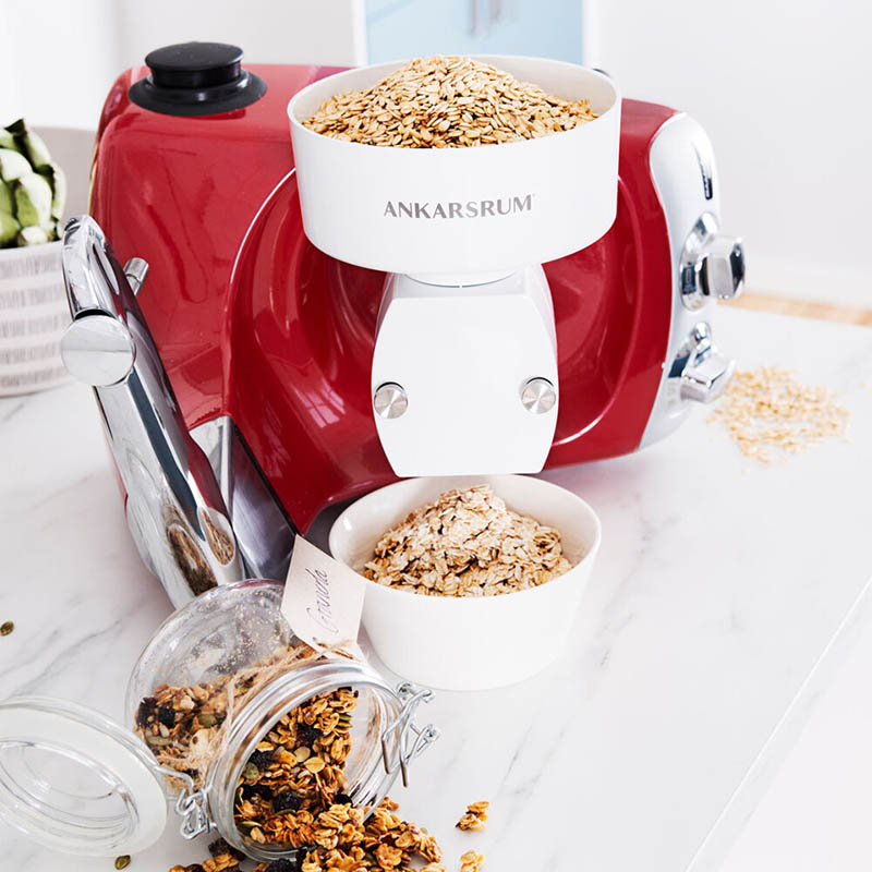 Ein Flockenquetsch-Aufsatz für die Ankarsrum Assistent Küchenmaschine. Dieser Aufsatz quetscht eingefülltes Getreide zu Flocken. Damit können z.B. Weizen, Hafer, Dinkel, Gerste, Reis, Quinoa oder Buchweizen verarbeitet werden. Die Ankarsrum Assistent in Verbindung mit der Flockenquetsche, gibt Ihnen die Möglichkeit Ihr eigenes Müsli aus Hafer, Getreide, Roggen oder Reis herzustellen.