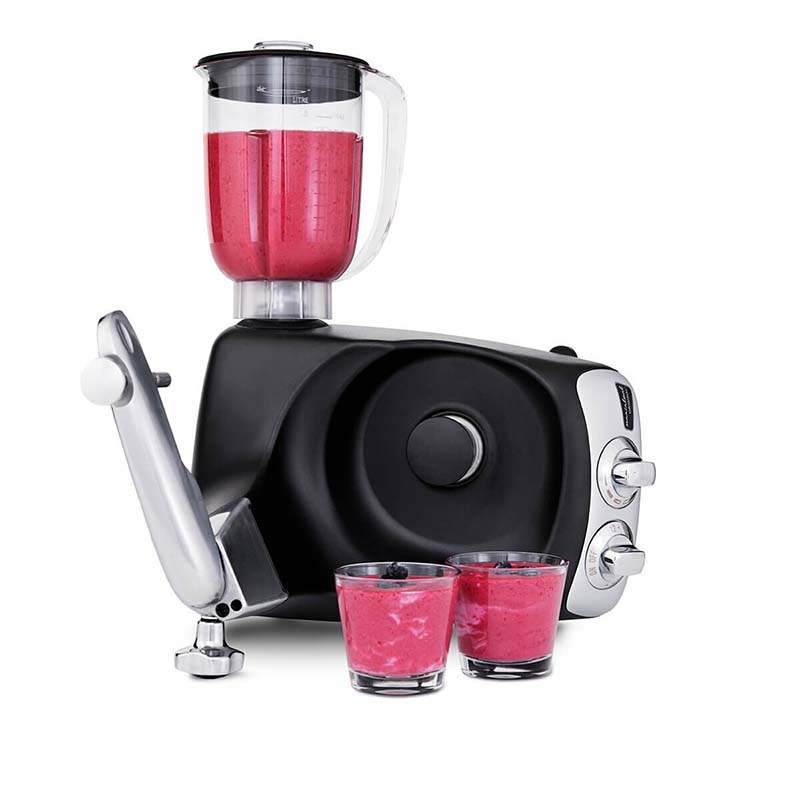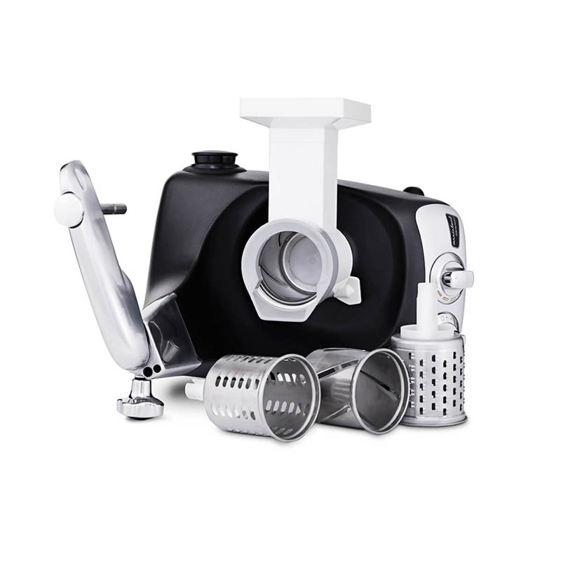 | Lieferumfang: | Gemüseschneider, Scheibentrommel, mittlere Reibetrommel, grobe Reibetrommel, Mixeraufsatz, Zitruspresse |