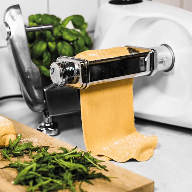 Mit dieser Walze können Sie Pastateig auswalzen. Diese Pastaplatten können Sie gut für Lasagne verwenden oder zu Pasta schneiden. Die Teigplatten die daraus entstehen, können auch anschließend mit der Fettuccine- oder Spaghettiwalze weiter verarbeitet werden. Den Teig am besten einige Male durch die Walze laufen lassen, bevor Sie die Dicke des Teiges stufenweise reduzieren.