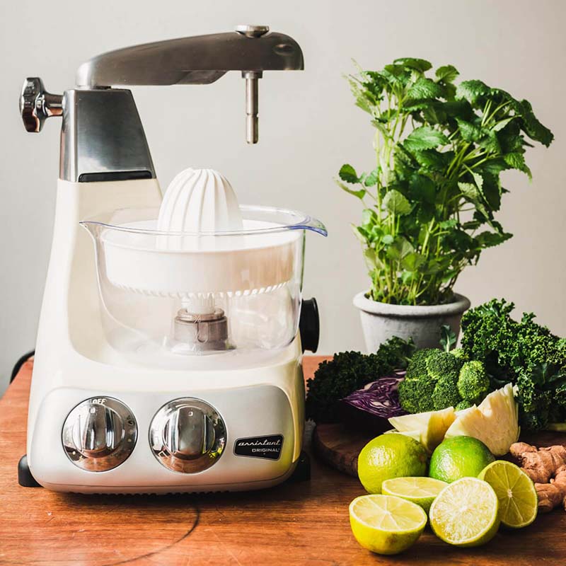 Ein Zitruspressen-Aufsatz als Zubehör zu Ihrer Ankarsrum Assistent Küchenmaschine. Eine schnelle, unkomplizierte und sehr kraftvoll arbeitende Zitruspresse. Für mehr Vitamine zum Frühstück. Mit dieser Zitruspresse können Sie Zitronen, Orangen, Limetten und Grapefruits pressen. Halbieren Sie die Früchte dafür einfach mit einem Messer.