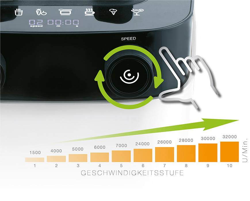 Das schicke Display zeigt die 8 wählbaren Automatikprogramme welche per Drehnopf ausgewählt werden können. Darunter sieht man Zeit und Geschwindigkeitssufen. Mit der Pulstaste, welche im rechten Drehknopf integriert ist, können Sie kurze Miximpulse geben. Die Start & Stopptaste befindet sich im linken Bedienknopf.