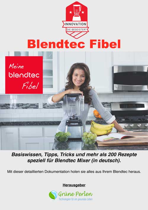 • inkl. der GrünePerlen Blendtec Fibel - Unser Guide für die ersten Schritte mit dem Blendtec in deutsch im A5 Ringbuch. Da Blendtec außer der Bedienungsanleitung keine deutsche Literatur mitliefert, haben wir für Sie die wichtigsten Informationen zusammengetragen und eine detaillierte Blendtec Startanleitung mit umfangreichen Rezeptteil, speziell für Blendtec Mixer, erstellt. Da wir selber begeisterte Blendtec Nutzer sind, können Sie uns außerdem bei Fragen rund um Ihren Blendtec natürlich gern auch nach dem Kauf kontaktieren. Details zu unserem einzigartigen Buch