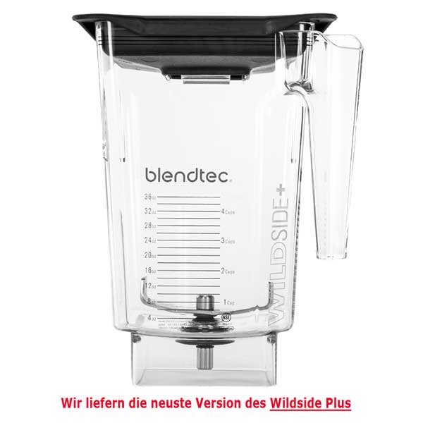 • Der größte Blendtec Behälter ist der Blendtec WildSide Jar. Blendtec-Wildside-JarDie Produktionsmenge liegt bei 400-1500ml. Der Wildside Jar hat die patentierte 5. Seite und ein größeres Messer. Der WildSide Jar ist damit sehr gut geeignet für größere Mengen Smoothies, Iced Drinks, Desserts, Brotteige, Mehl & extra dicke Ergebnisse. Der Wildside Jar ist der beste Blendtec Behälter für grüne Smoothies, weil das größere Messer, die größte Durchschlagskraft & die höchste Messergeschwindigkeit an der Außenkante erreicht, damit werden die grünen Smoothies besonders fein & cremig. Die empfohlene maximale Füllmenge beim Einfüllen von reinen Flüssigkeiten liegt bei ca. 1,5 Litern, die theoretische Gesamtfüllmenge liegt bei 2,6 Litern, wenn man den Jar bis zum Rand mit Mixgut füllt. Beim Blendtec Designer 625, 650, 725 und bei Blendtec Professional 750 & 800 wird dieser Wildside Jar als Standardbehälter mitgeliefert, bei uns haben Sie allerdings freie Behälterwahl.