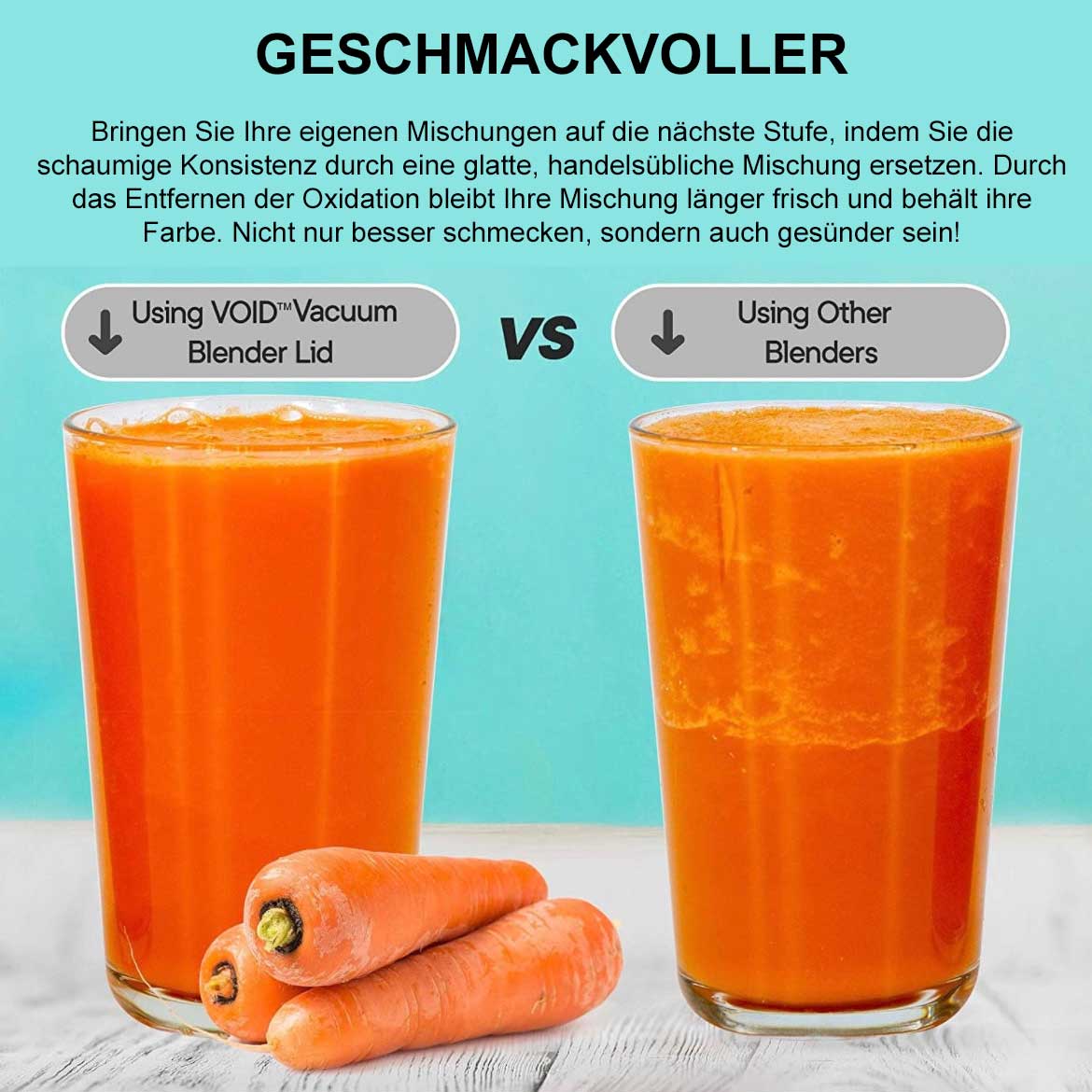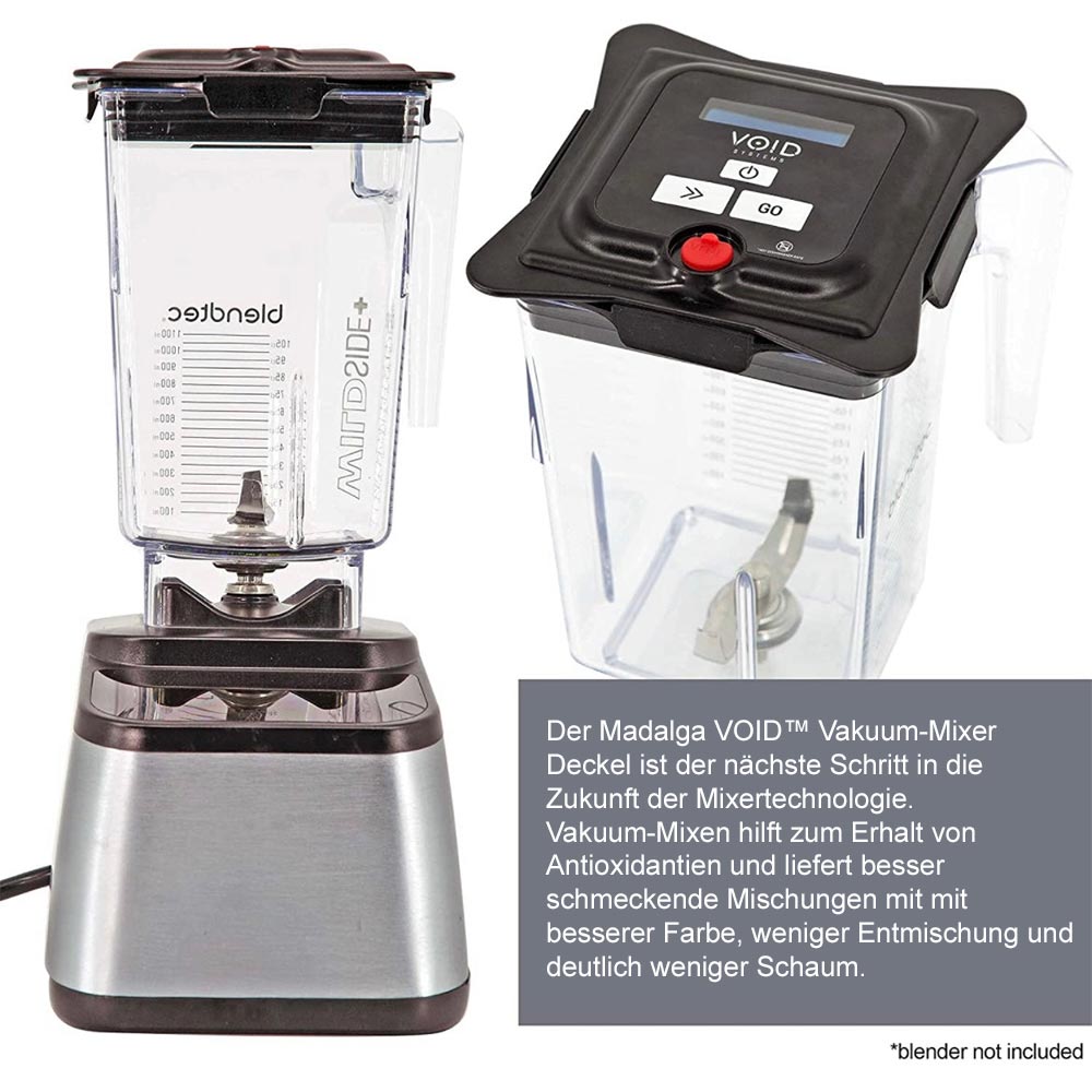 Der Vakuum-Mixer-Deckel wurde von VOID in den USA entwickelt und hergestellt und ist der nächste Schritt in die Zukunft der Mixertechnologie. Vakuum-Mixen hilft bei der Erhaltung von Antioxidantien und liefert besser schmeckende Mischungen mit besserer Farbe, weniger Trennung und deutlich weniger Schaum. Endlich steht die Vakuum Funktion für alle Blendtec Blender bzw. Hochleistungsmixer zur Verfügung.