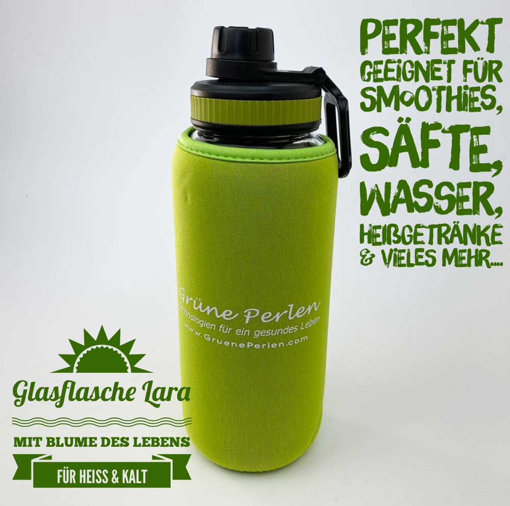 Diese praktische Flasche aus Glas hebt sich von allen anderen im Internet angebotenen, ähnlichen Flaschen ab. Wir haben diese besondere Flasche nach unseren Vorgaben produzieren lassen. Die Glasflasche "Lara", aus hitze & kältebeständigem Borosilikatglas, hat einen wunderbaren Trinkverschluss, mit großer Öffnung zum einfachen befüllen und reinigen und kleiner Öffnung für ein gut dosiertes Trinken. Die Glasflasche "Lara" besitzt außerdem das hochenergetische Symbol der Blume des Lebens.