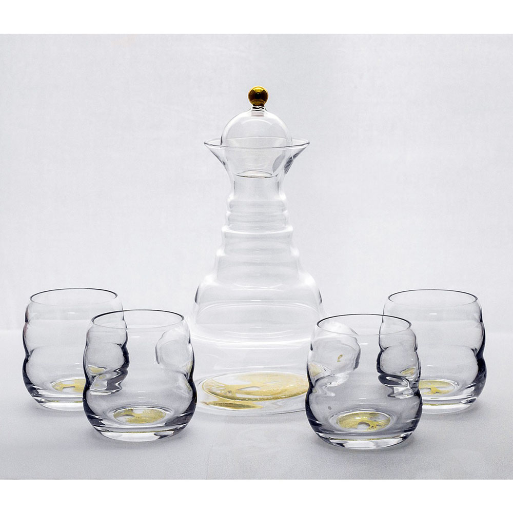 Der Lebensbaum ist in 23,8 Karat Gold von aussen/unten am Karaffen- und Gläserboden eingebrannt. Die obere Kugel des Kronenstöpsels ist ebenfalls vergoldet.