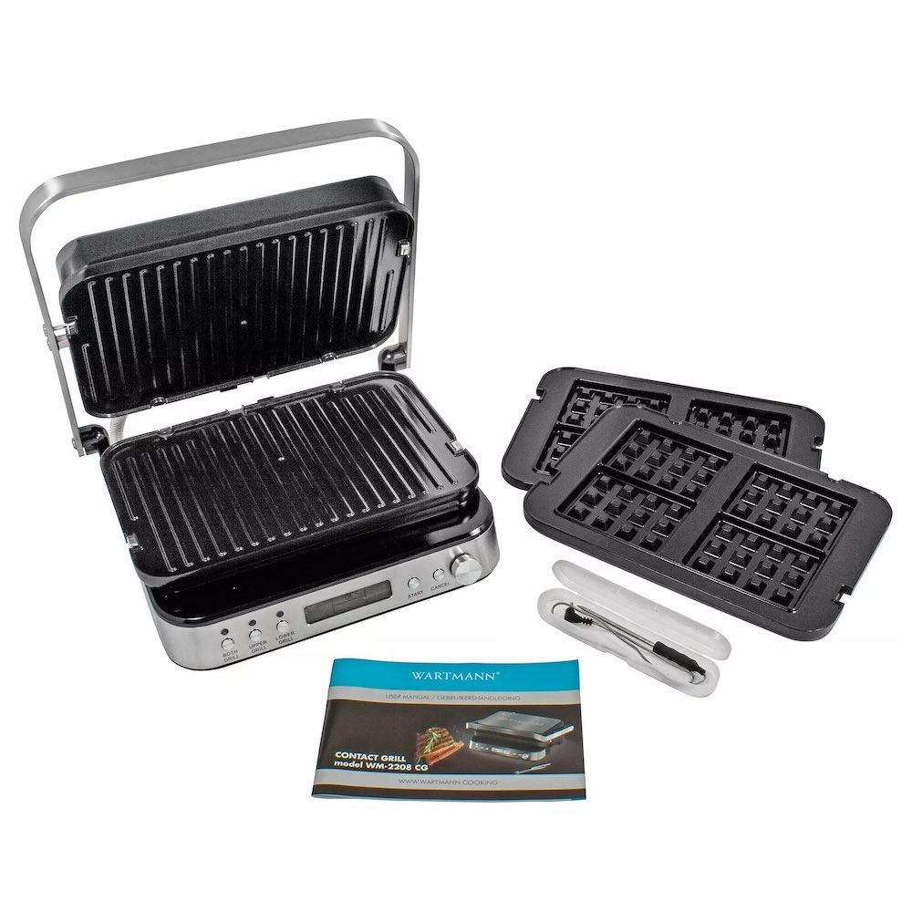 Kontaktgrill, Wendeplatten mit glatten und geriffelten Seiten, Waffeleinsätze, Temperaturmessgerät, Abtropfschale, Bedienungsanleitung