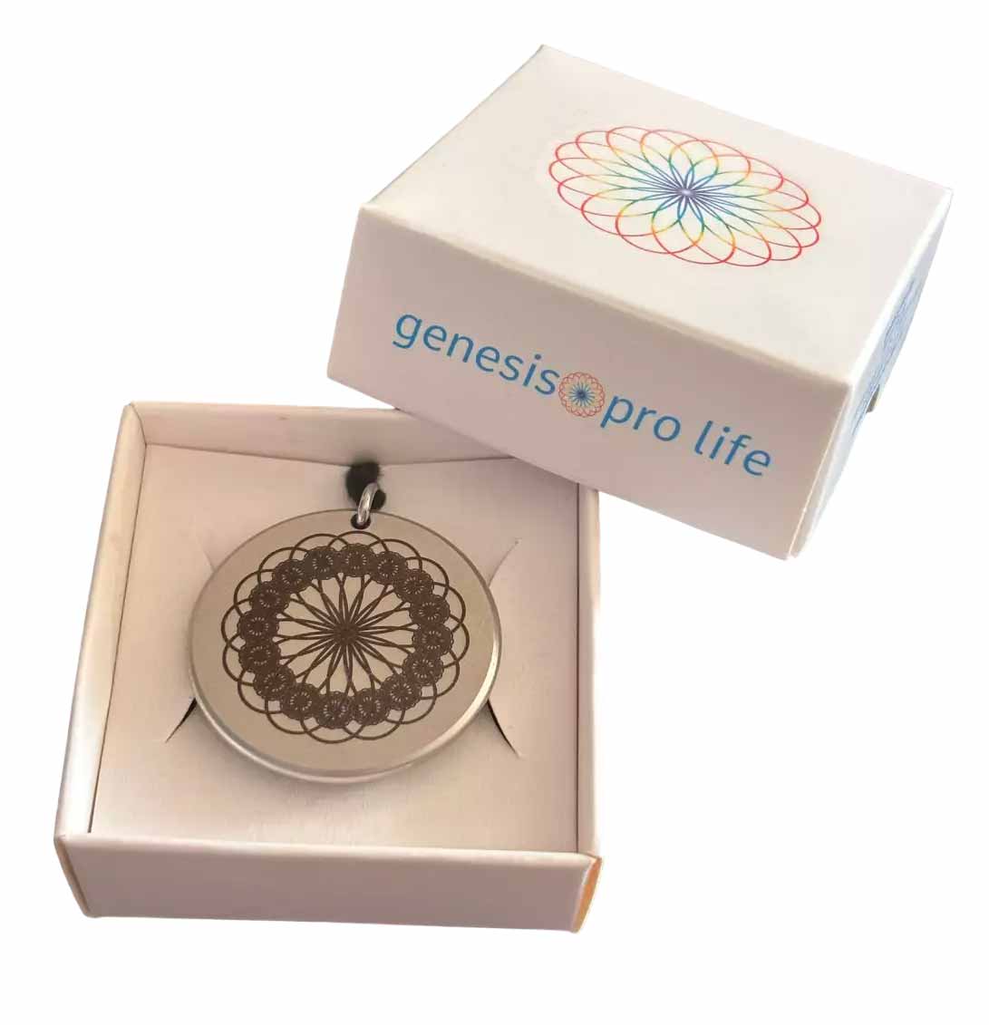 WLAN/DECT/Mobilfunk/Mikrowellen/Magnetische/Erd/Mental- Strahlungsfelder werden schnell und wirksam energetisch aufgewertet und optimiert. Das Amulett hat auf beiden Seiten die genesis pro life Symbole mit Lasertechnik eingraviert. Die Symbole auf beiden Seiten sind um 90° versetzt. Das Biophotonen Amulett besteht aus hochwertigem chirurgischem Edelstahl und ist dadurch extrem widerstandfähig und hautfreundlich. Das runde, filigrane schwarze Trageband (80cm Länge) besteht aus Baumwolle und bietet hervorragenden Tragekomfort. Das Amulett wiegt 14,5 g - mit Trageband 15 g und hat einen Durchmesser von 33,33 mm. Das Amulett wird inklusive Trageband geliefert.