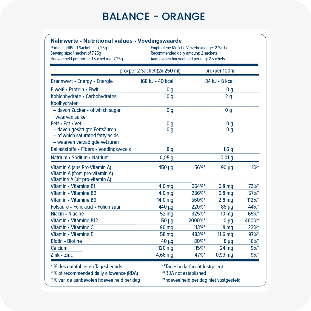 Zutaten: Guarkernmehl, Orangenaroma, Verdickungsmittel: Hydroxypropylmethylcellulose, Gummi Arabicum, Maltodextrin aus Mais, Johannisbrotkernmehl, Extrakt weißer Bohnen, Pektin, Haferfasern, Orangensaftpulver, Säuerungsmittel: Zitronensäure, Ginsengaroma, Calciumcarbonat, L-Ascorbinsäure, Beta-Carotin, Beta-Glucan, Süßstoff: Sucralose, alpha-Tocopherylacetat, Niacinamid, Zinkgluconat ,Folsäure, Biotin, Thiaminhydrochlorid, Pyridoxinhydrochlorid, Riboflavin, Brokkolipulver, Natriumselenit, Chromchlorid, Cyanocobalamin