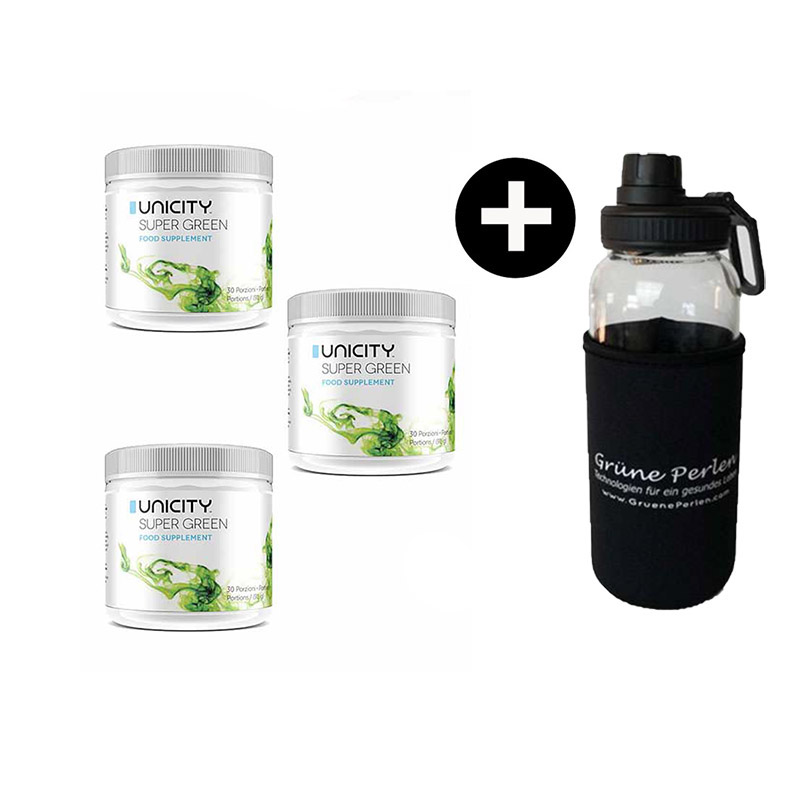 Bei Auswahl des optionalen Pakets mit 3 x SuperGreen erhalten Sie unsere hochwertige Glasflasche "Lara" oder die Unicity Matcha Bottle zum Spezialpreis