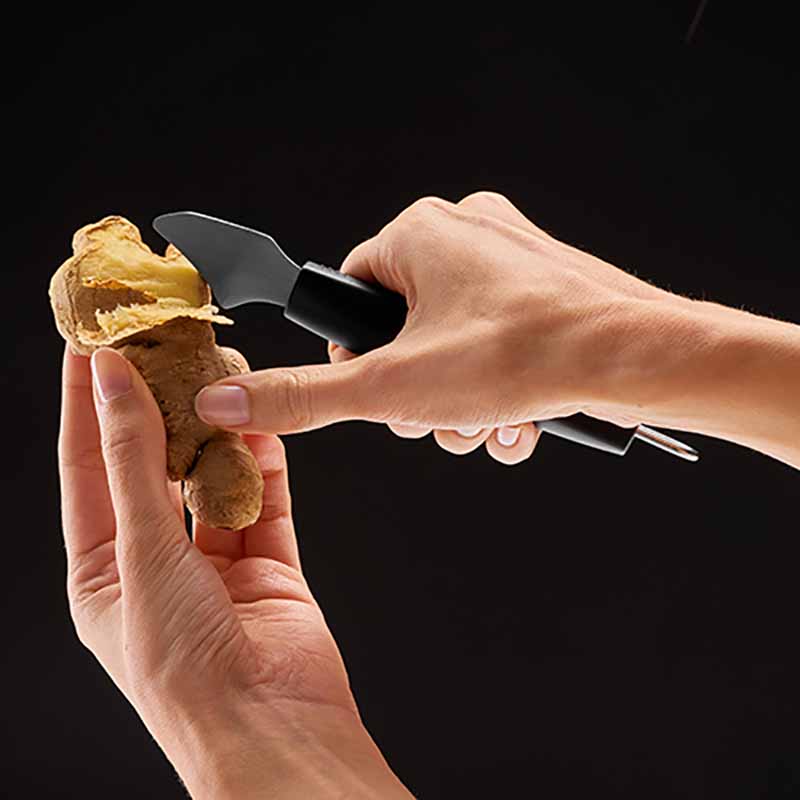 Der Ingwerschäler verfügt, wie alle anderen Produkte der Tangoserie, über einen ergonomischen Griff, welcher ein korrektes Greifen und ein angenehmes Arbeiten gewährleistet. Egal ob Links- oder Rechtshänder, dieses Tool ist für ein ganz bequemes und ermüdungsfreies Schaben der Ingwerhaut geeignet.