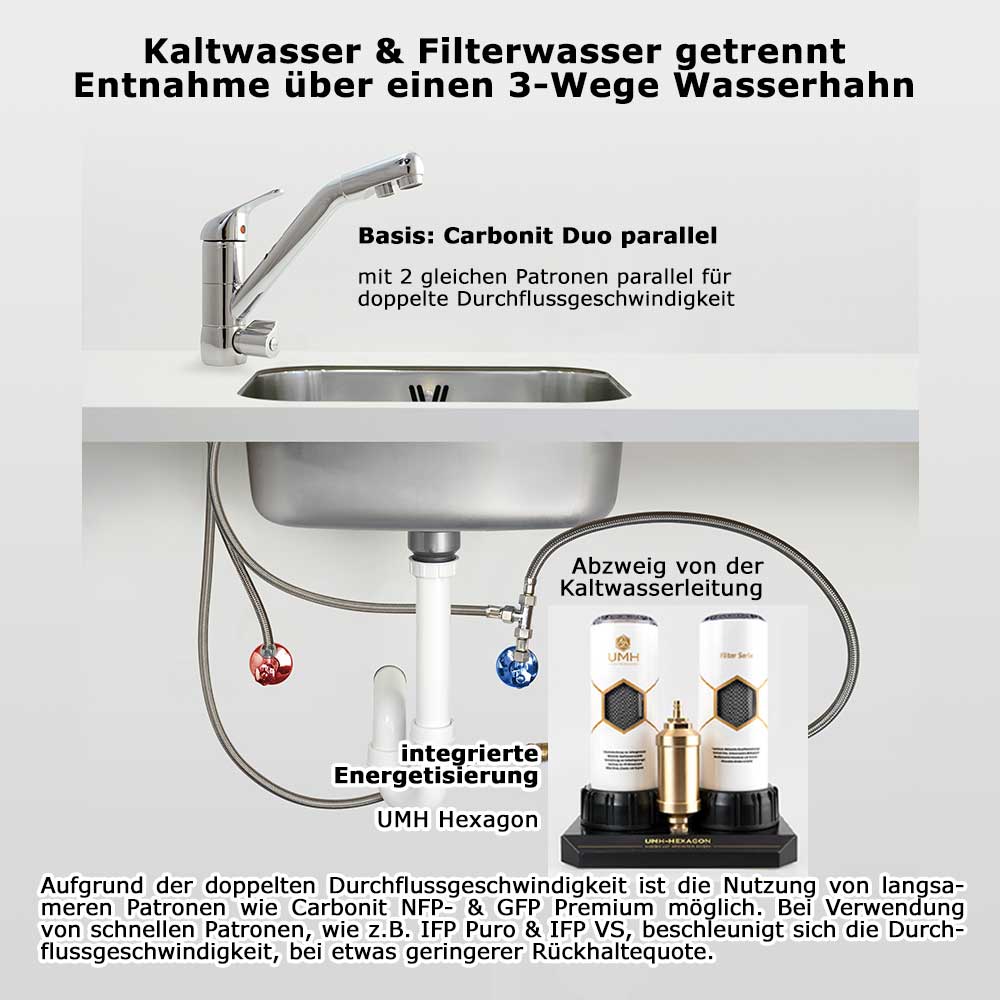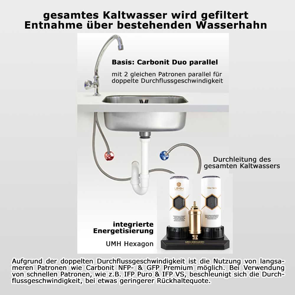 Das UMH Hexagon wird mit mit einem Carbonit DUO-Filter parallel betrieben und kann somit eine hohe Durchflussgeschwindigkeit (4-6 L/min) erreichen!  Hinweis: Aktuell wird das UMH Hexagon mit 2x GFP-Premium-D Patronen, statt der regulären GFP-Premium ausgeliefert. Die GFP-Premium-D hat eine Feinheit von 0,6μm und ist damit noch etwas schneller als die reguläre GFP-Premium mit 0,4μm Feinheit. Dadurch beschleunigt sich der Durchfluss etwas. Sehr sinnvoll bei der schnellen Installationsvariante, bei der das gesamte Kaltwasser gefiltert wird. Sollten Sie die Installation als Abzweig mit separatem Wasserhahn oder 3-Wege Wasserhahn bevorzugen, empfehlen wir Ihnen beim ersten Filterwechsel die feineren GFP-Premium (0,4μm) oder GFP-Premium-U9 (0,3μm)  als Ersatzfilter nachzukaufen, da dann der schnelle Durchfluss keine tragende Rolle spielt, dafür aber die Filterleistung etwas besser ist.