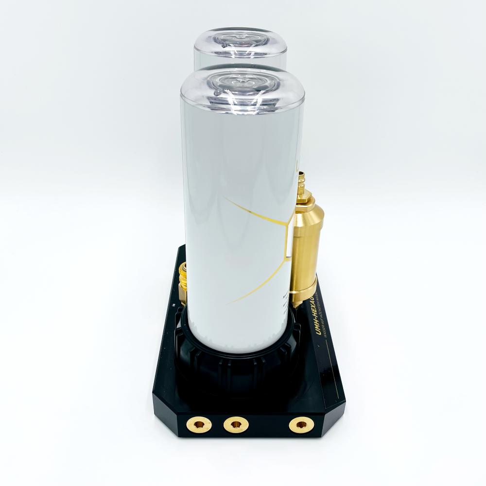 Nachdem das Wasser gefiltert wurde, durchfließt es eine Neuentwicklung der UMH Technologie. Ein neues, besonders schlankes & kompaktes UMH Gerät, das 10 verschiedene und handgefertigte Glasphiolen enthält, die ein hochstabiles Energiefeld erzeugen. Dadurch bekommt ihr Wasser eine hexagonale Struktur und wird zellverfügbar gemacht. Des weiteren wurde auf UV-behandeltes Wasser Rücksicht genommen. Trinken Sie ihr Wasser mit hochwertiger Quellwasserqualität! Das neue UMH Hexagon gibt es nur als Komplettsystem. Das verbaute neue UMH Gerät ist nicht einzeln erhältlich! Das Hexagon hat ein ausgezeichnetes Preis/Leistungsverhältnis und ist dabei von der Wirksamkeit etwas besser als ein UMH Pure + UMH Pure UV. Wer sich mit den einzelnen UMH Geräten beschäftigt hat weiß, dass diese Kombination fast mit einem UMH Delta vergleichbar ist, welches allein, komplett ohne Filtersystem, bereits weit mehr kostet, als das UMH Hexagon Komplettsystem! Sie sehen also, es handelt sich hierbei um ein wirklich besonderes Angebot. Das UMH Hexagon Komplettsystem ist sogar günstiger als ein einfacher Carbonit Vario-HP mit nur einer Patrone und einem UMH Master 1/2 Zoll Gold.