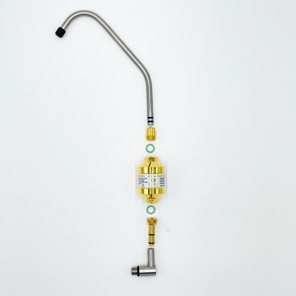 Das Alvito Auftisch-Filtersystem Set mit UMH Pure ist eine kostengünstige und flexible Lösung, um zu Hause frisch gefiltertes hexagonales Wasser direkt aus dem Wasserhahn zu genießen. Die Installation ist besonders schnell und einfach. Setzen Sie einfach den Aktivkohle-Blockfilter ein, schrauben Sie das mitgelieferte Umschaltventil an Ihren Wasserhahn und genießen Sie gefiltertes Trinkwasser frei von unerwünschten Schadstoffen. Der hohe Auslauf erleichtert die Ausgabe von gefiltertem Trinkwasser. Das geringe Gewicht und die kompakte Größe des Alvito Auftischfilters erleichtern auch eine einfache Mitnahme.