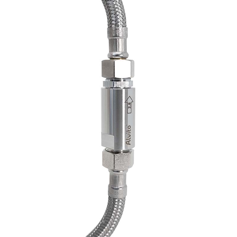 Die Wirbelkammer des Alvito Inline Wirbler 2.8 hat eine optimierte Form und sorgt für eine hocheffiziente Verwirbelung mit einer maximalen Wirksamkeit. Die Produktion und Entwicklung der Alvito Wasserwirbler erfolgt in Deutschland mit den präzisesten und modernsten Maschinen. Der verwendete Edelstahl (1.4404) wird ebenfalls in der Lebensmittelindustrie verwendet, da er eine sehr gute Korrosionsbeständigkeit aufweist. Ideal für die Anwendung nach Aktivkohlefiltersytemen. Kompatibel ist der Wirbler mit allen Filtereinsätzen von Alvito, sowie den Carbonit Filtereinsätzen wie z.B. NFP Premium, EM Premium, IFP Puro und EM Puro. Der Alvito Inline Wirbler 2.8 wird Inline, also unter der Spüle, zwischen Wasserhahn und Wasserleitung eingebunden. Die Anschlussgröße beträgt 3/8 Zoll DN10 für Flexschläuche. Die Durchflussgeschwindigkeit beträgt mindestens 2 und maximal 8 Liter pro Minute.