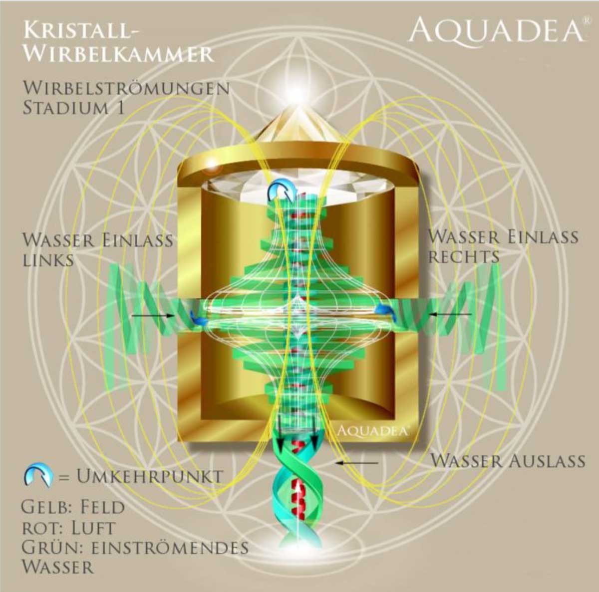In der speziell entwickelten Aquadea Gold Wirbelkammer wird das einfliessende Wasser extrem beschleunigt und gewinnt so seine ureigene Kraft und Dynamik zurück. Die vom Wasser aufgenommene Eigenschwingung von Gold überträgt sich auf Ihren Körper und benetzt mit frischer Lebendigkeit. Zugleich saugt die spezielle Gold-Wirbelkammer mehr Luft ein, als Wasser heraustritt. Die Luft wird negativ elektrisch geladen wie an einem hohen Wasserfall und der Sauerstoff-Gehalt im Wasser erhöht sich durch Sog. Ideal für körperliches Wohlbefinden. Der obere Bereich des Wirbel-Torus triff auf reinen Bergkristall und bringt diesen zum Schwingen: enorme Verstärkung des Bergkristalls.