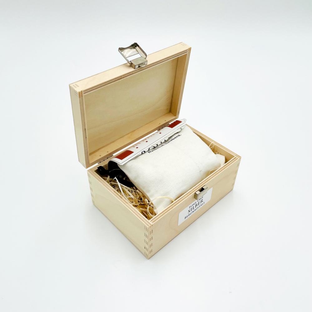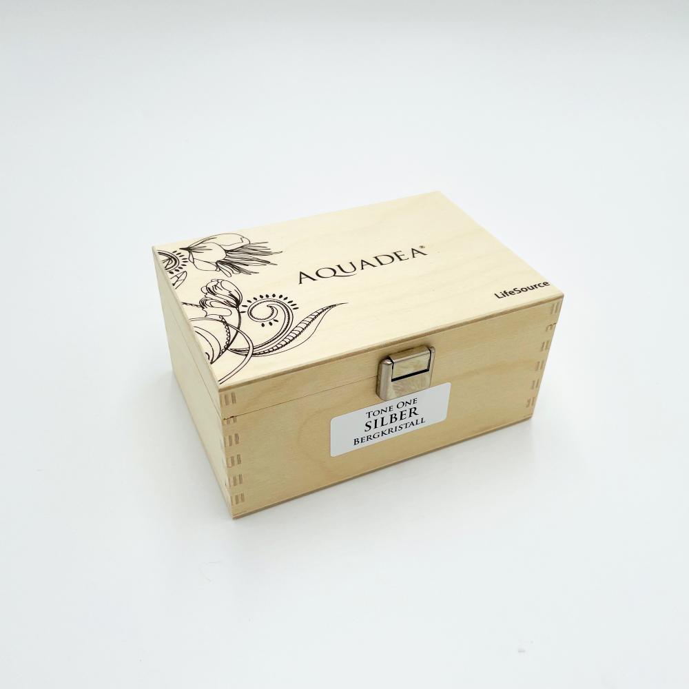 Trinkwasserwirbler mit Bündeldüse, Gewindeadapter, Holzkästchen, Stoffsäckchen, Aktion: Glasflasche Lara auf Wunsch gratis dazu