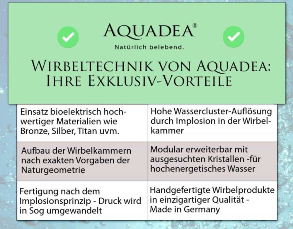 Die Produkte der Marke Aquadea® basieren auf den Grundlagenforschungen und Erkenntnissen von Archimedes von Syrakus, Leonhard Euler & Viktor Schauberger. Bei Aquadea® Wasserverwirblern und Wirbelduschen kommen nur Materialien von höchster Güte zum Einsatz. Die nachhaltige Produktion erfolgt ausschließlich in Deutschland. In der Aquadea Wirbel-Manufactur im bayerischem Maisach werden die Kristall-Wirbel-Produkte sorgfältig von Hand, oft speziell für den einzelnen Kunden assembliert. Es werden primär Materialien verwendet, die Viktor Schauberger als bioelektrisch vorteilhaft bezeichnet hat: Bronze, Kupfer & Edelmetalle. Die sonst handelsüblichen Materialien wie Edelstahl gehören nicht dazu. Beim Einsatz der Aquadea Wasserwirbler & Wirbelduschen entstehen Wirbel aus Wasser mit natürlichen, reinigenden und belebenden Eigenschaften. Langjährige Erfahrung in der Materialforschung und der absolute Wille zu höchster Qualität charakterisieren Aquadea.