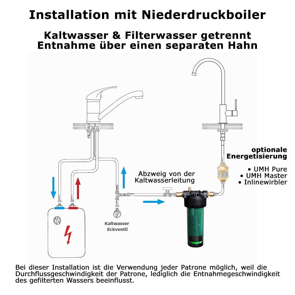 - Anschluss an normalem Wasserhahn - Kaltwasser wird generell durch den Filter geleitet und Filterwasser kommt als Kaltwasser aus dem normalen Wasserhahn. Sinnvoll nur bei der Duo-HP Parallel Variante mit 4l/min Durchfluss.