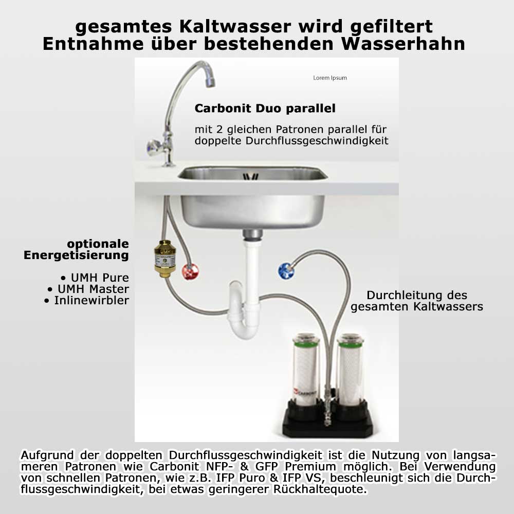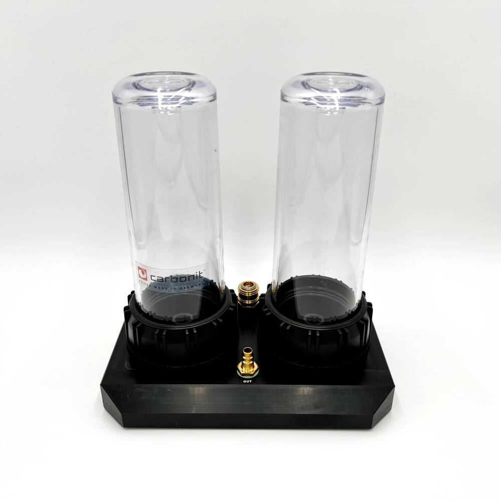 Der Carbonit Duo-HP ist in 2 unterschiedlichen Varianten erhältlich. Eine serielle Schaltung und eine parallele Schaltung der 2 Filterpatronen. Dieses Produkt ist die parallele Ausführung des Carbonit Duo HP.