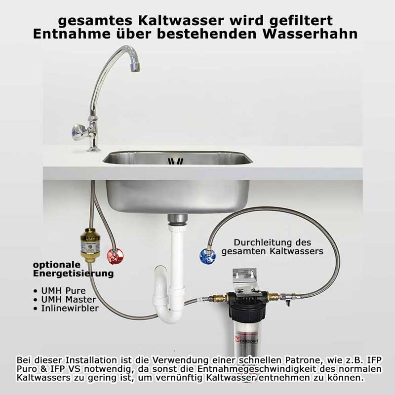 Weiterhin eignet sich die Patrone perfekt, wenn Sie eine schnelle Patrone brauchen, um das komplette Kaltwasser unter der Spüle zu filtern, also wenn Sie nicht "auf Abzweig" installieren wollen. Sie benötigen dann nur ein Filtergehäuse und diese schnelle Patrone, Sie können das gesamte Kaltwasser durchleiten und benötigen KEINEN separaten Wasserhahn bzw. keinen 3-Wege-Wasserhahn. Sie können Ihren bisherigen Wasserhahn behalten und filtern einfach das komplette Kaltwasser. Die normalen Standardpatronen eignen sich dafür nicht, weil dann eben nur 2-4 Liter pro Minute durchgehen. Das reicht nicht für eine angenehme Entnahme. Mit dieser Carbonit IFP-VS Patrone erreichen Sie dagegen eine Durchflussgeschwindigkeit von ca. 10-15 Liter pro Minute.