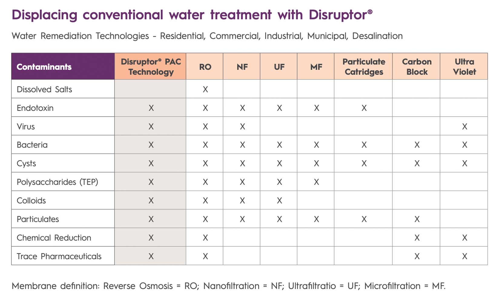 - Im Vergleich zu UF/Hohlfasern und Membranen bietet Disruptor® hohe Flussraten bei geringem Druckverlust, eignet sich für Schwerkraft- und Drucksysteme und benötigt weniger Material.