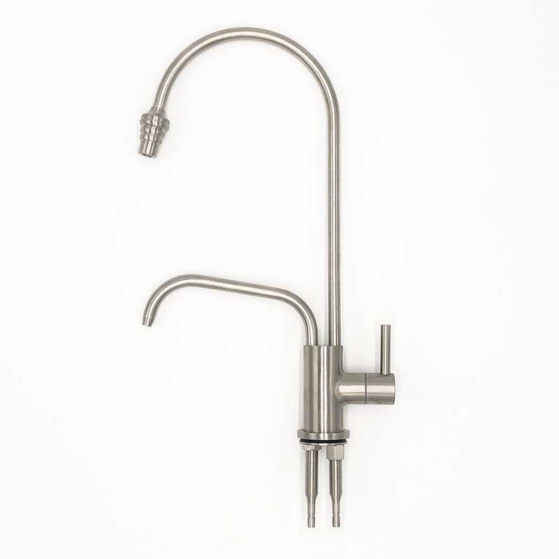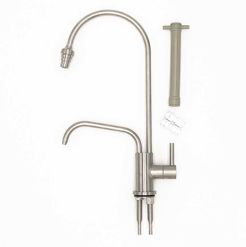 Ein einfacher & eleganter Wasserhahn aus Edelstahl mit Vierteldreh-Ventil und freiem Spülwasserauslauf. Ideal für Umkehrosmoseanlagen geeignet. Mit integriertem Mini-Wasserwirbler am Auslauf.