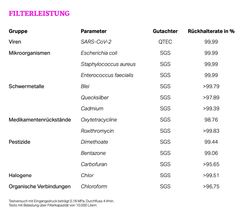 Das getestete Filtergranulat besteht aus Apfelsäure (L-Malic Acid), Polyethylen und Aktivkohle. Alle Komponenten erfüllen die Anforderungen der EU-Trinkwasserrichtlinie 2020/2184, sind MOCA- und FDA-zertifiziert und wurden von SGS zusätzlich toxikologisch bewertet. -