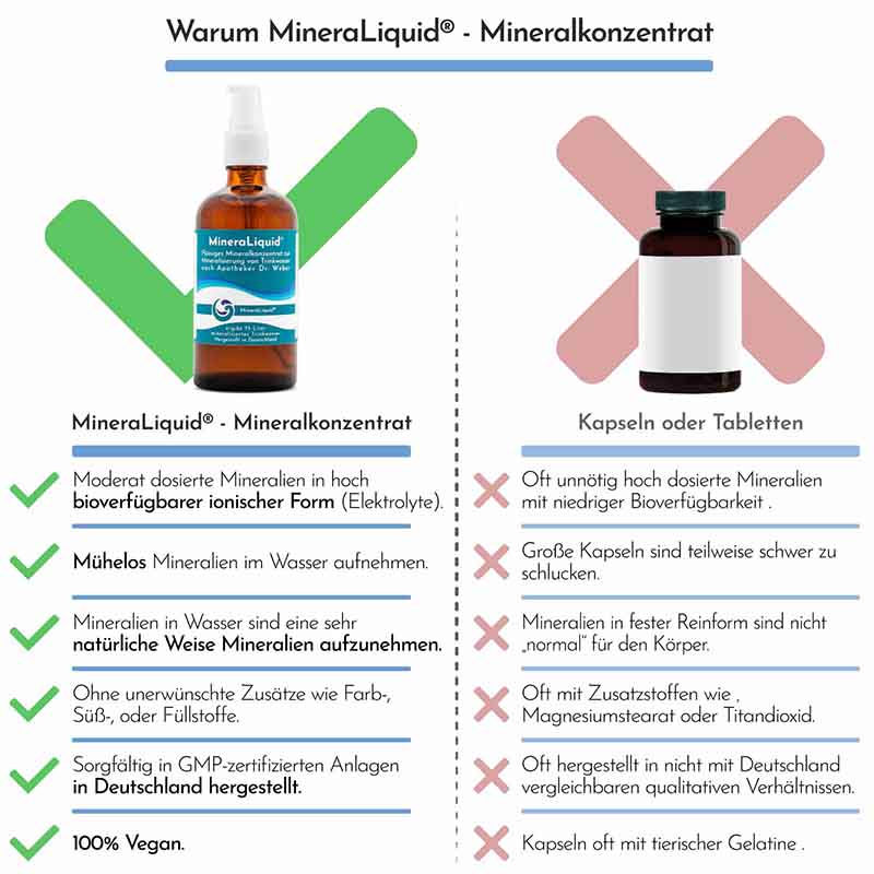 MineraLiquid ist ein flüssiges Mineralkonzentrat, welches zur Mineralisierung von Wasser und zur Herstellung von Mineralgetränken verwendet werden kann. Trinkwasser enthält neben Mineralien auch Spurenelemente und unterstützt den Elektrolythaushalt. MineraLiquid® ist ein Nahrungsergänzungsmittel mit Magnesium, Calcium, Kupfer, Zink, Molybdän und Mangan.