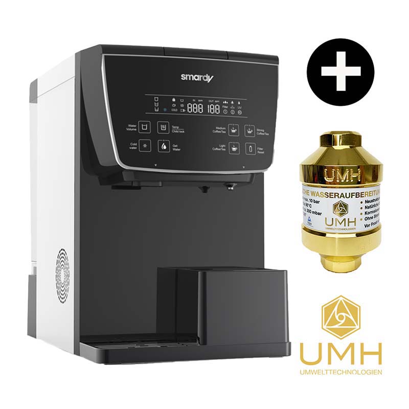 Originallieferumfang: Basisgerät mit integriertem UMH Pure, Filterset, Netzkabel, smardyblue Pflegeset (Accessory Kit) mit 3 Überbrückungskartuschen, Bedienungsanleitung (mehrsprachig) | GRATIS bei uns: Glasflasche Lara auf Wunsch