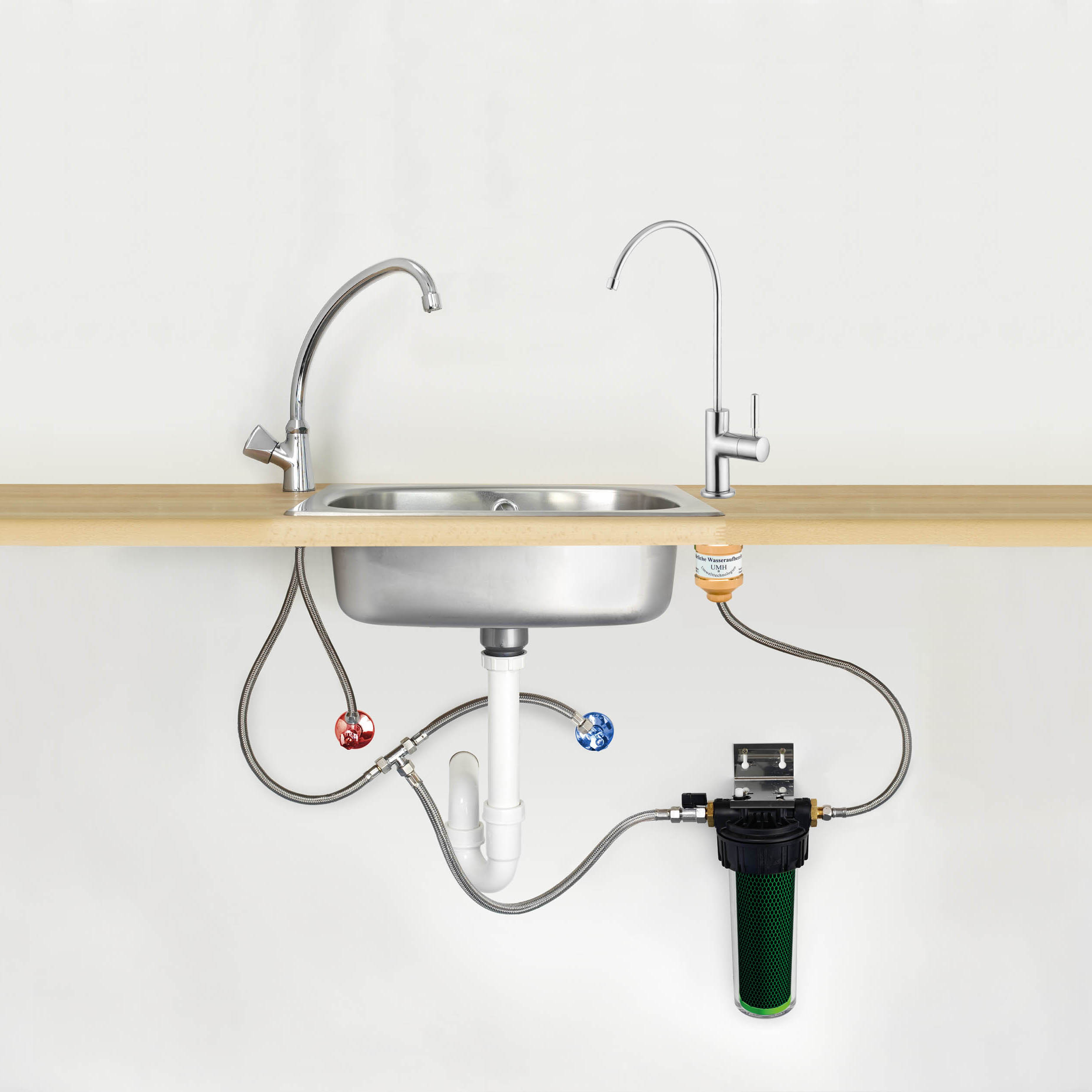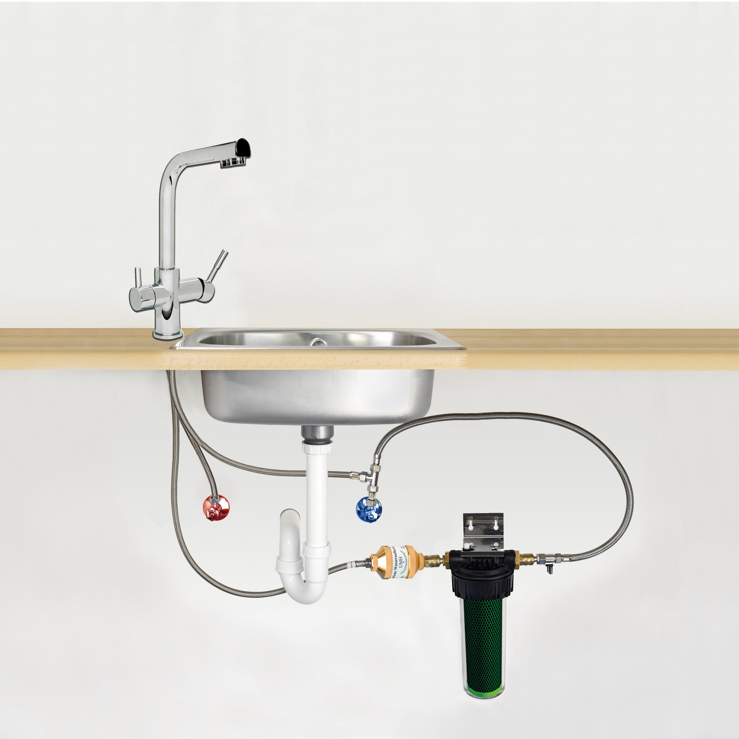 Wenn Sie Ihren QuickHexaFlow Single oder Double Untertischfilter auf Abzweig installieren möchten, benötigen Sie einen passenden Wasserhahn für den Filterwasserauslauf. Es gibt die Möglichkeit, einen einzelnen Solo-Hahn in Ihre bestehende Spüle zu installieren. Dafür müssten Sie aber ein zusätzliches Loch hineinbohren. Sollten Sie zur Wasserentnahme nur eine Armatur auf der Spüle haben wollen, können Sie mit einem komfortablen Drei-Wege-Wasserhahn Ihre bestehende Armatur ersetzen und über einen separaten Hebel Ihr Trinkwasser zapfen. Dieses kommt dann meist über einen separaten Auslauf aus dem Wasserhahn. Ein Drei-Wege-Wasserhahn ist die ideale Lösung, wenn Sie keinen zusätzlichen Wasserhahn für das gefilterte Wasser installieren möchten. Er spendet normales Leitungswasser (kalt und heiß) sowie auch gefiltertes Wasser über getrennte Leitungen. Wir haben eine große Auswahl hochwertiger