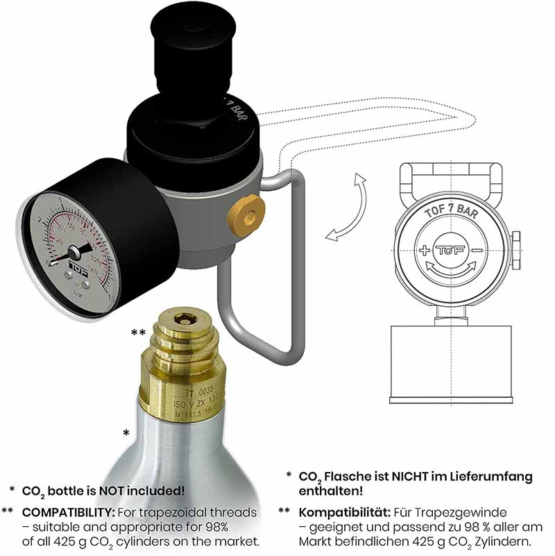 Druckminderer für die Nutzung aller gängigen und im Handel erhältlichen Mehrwegflaschen mit 425g CO2 Zylindern (Trapezgewinde) geeignet.