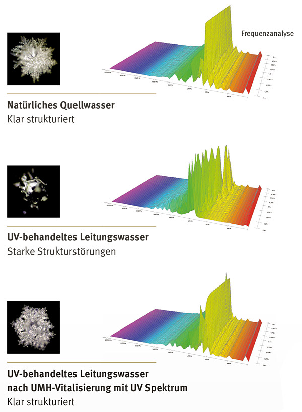 Des weiteren bedarf es noch einer entsprechenden Frequenz im Wasser. Diese beträgt 22,5 Hz. Diese Frequenz wird benötigt um die Aquaporine (Ionenkanäle in der Zellhaut) überhaupt in ausreichendem Maße passieren zu können. Die Frequenz der Zellmembran ist laut Untersuchungen des Bioresonanzforschers Paul Schmidt 22,5 Hz, somit die körpereigene Stoffwechselfrequenz. Bei Untersuchungen des Schweizer Institutes Planet Diagnostic zeigte sich, dass gutes Quellwasser eine Grundfrequenz von 22 Hz und die Oberwellen 44 und 66 Hz betragen und stets gegeben sind. Die Frequenzen von UV-behandeltem Wasser sind schlecht strukturiert und instabil. Eine sogenannte disharmonische Schwingung. Die enorme Verschlechterung der Quellwasserqualität nach einer erfolgten UV-Behandlung hat auch Dr. Kohfink aus München mit seinen Exahertzmulitmeter- (Höchstfrequenz) sowie radiästhetischen Messungen eindeutig belegt.