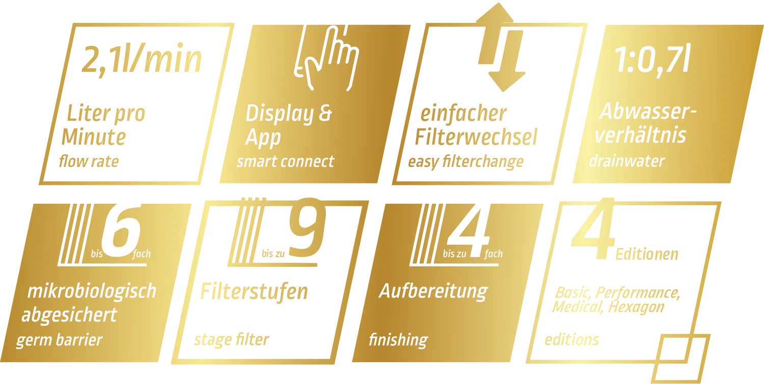 | Filterstufen: | 1. Sediment (PP), 2. Aktivkohle (CTO), 3. UO-Membran 0,0001µm, 4. UF Keimsperre (optional), 5. Mineralisierung (optional), 6 Filterstufen, 6. Energetisierung (optional) |