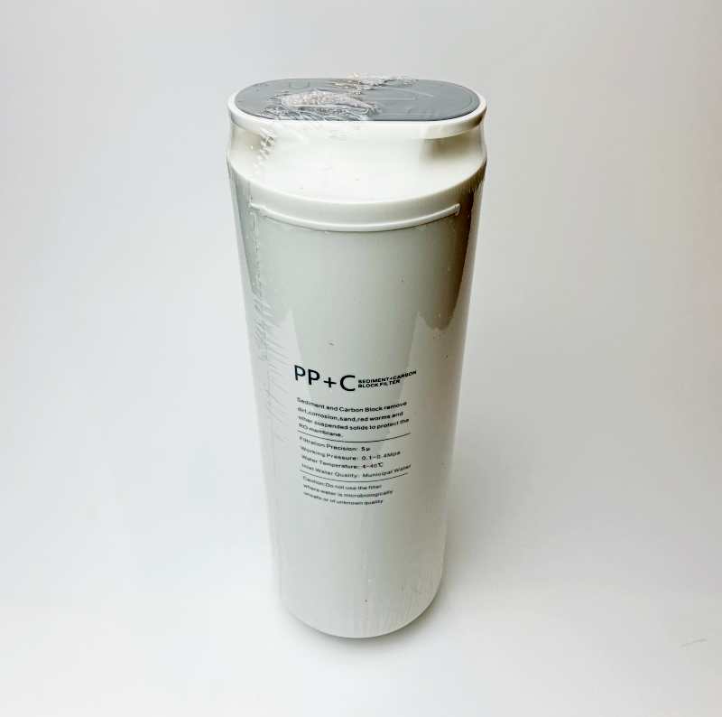 1. & 2. Stufe: PP 5 µm “melt blown” Polypropylene Sediment Filter + CTO Carbon Block Patrone Aktivkohleblock.