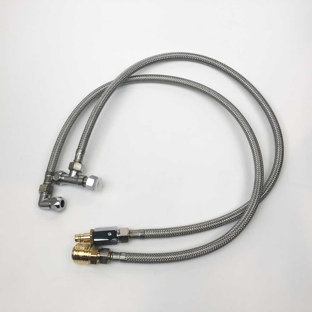 ein- und ausgangsseitig ein Flex-Schlauch, 800mm lang mit Kupplung Rectus NW7.2; eingangsseitig zusätzlich integrierter Absperrhahn, T-Stück (3/8" Überwurfmutter, 2x 3/8'' Außengewinde), ausgangsseitig Winkelstück 90° (3/8" AG, 10mm Quetschverbindung), Dichtungen gemäß Produktzeichnung
